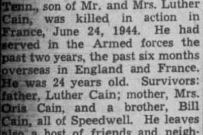 Pvt. Cleo Cain, of Speedwell, Tenn., son of Mr. and Mrs. Luther Cain was killed in action in France, June 24, 1944. He had served in the Armed forces the past two years, the past six months overseas in England and France. He was 24 years old. Survivors: father, Luther Cain; mother, Mrs. Oris Cain, and a brother, Bill Cain, all of Speedwell. He lease also a host of friends and neighbors.