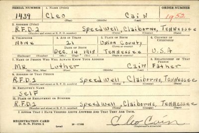 Lawrence Cleo Cain (Cleo Cain) was born in Claiborne County, Tennessee December 14, 1918, the son of Leonidas Luther Cain and Artie Oris Taylor.