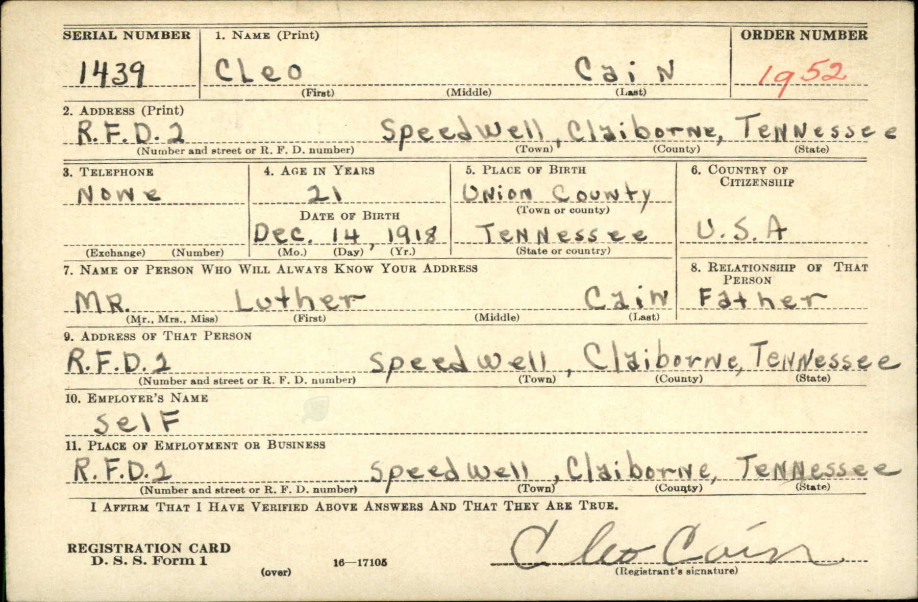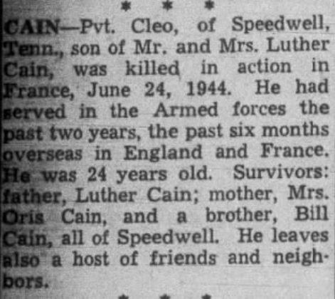 Pvt. Cleo Cain, of Speedwell, Tenn., son of Mr. and Mrs. Luther Cain was killed in action in France, June 24, 1944. He had served in the Armed forces the past two years, the past six months overseas in England and France. He was 24 years old. Survivors: father, Luther Cain; mother, Mrs. Oris Cain, and a brother, Bill Cain, all of Speedwell. He lease also a host of friends and neighbors.