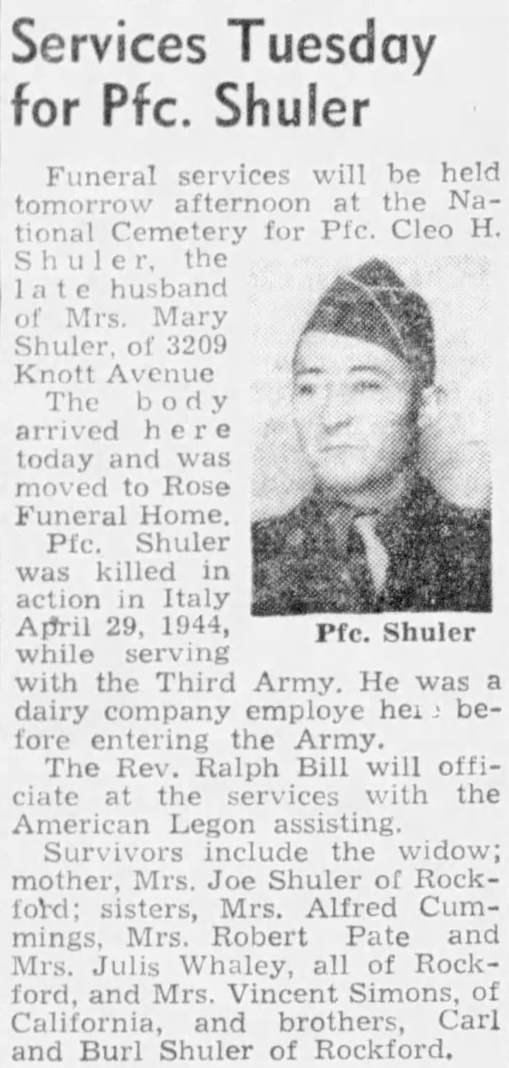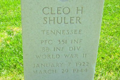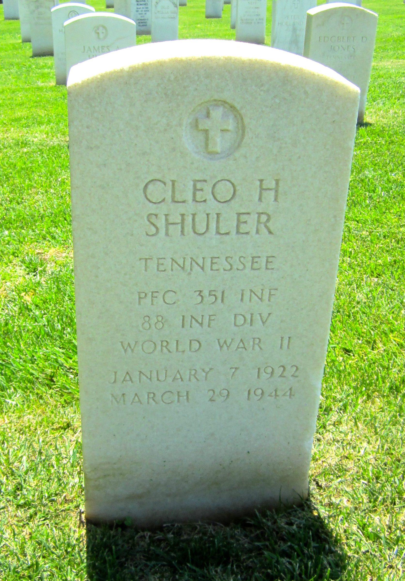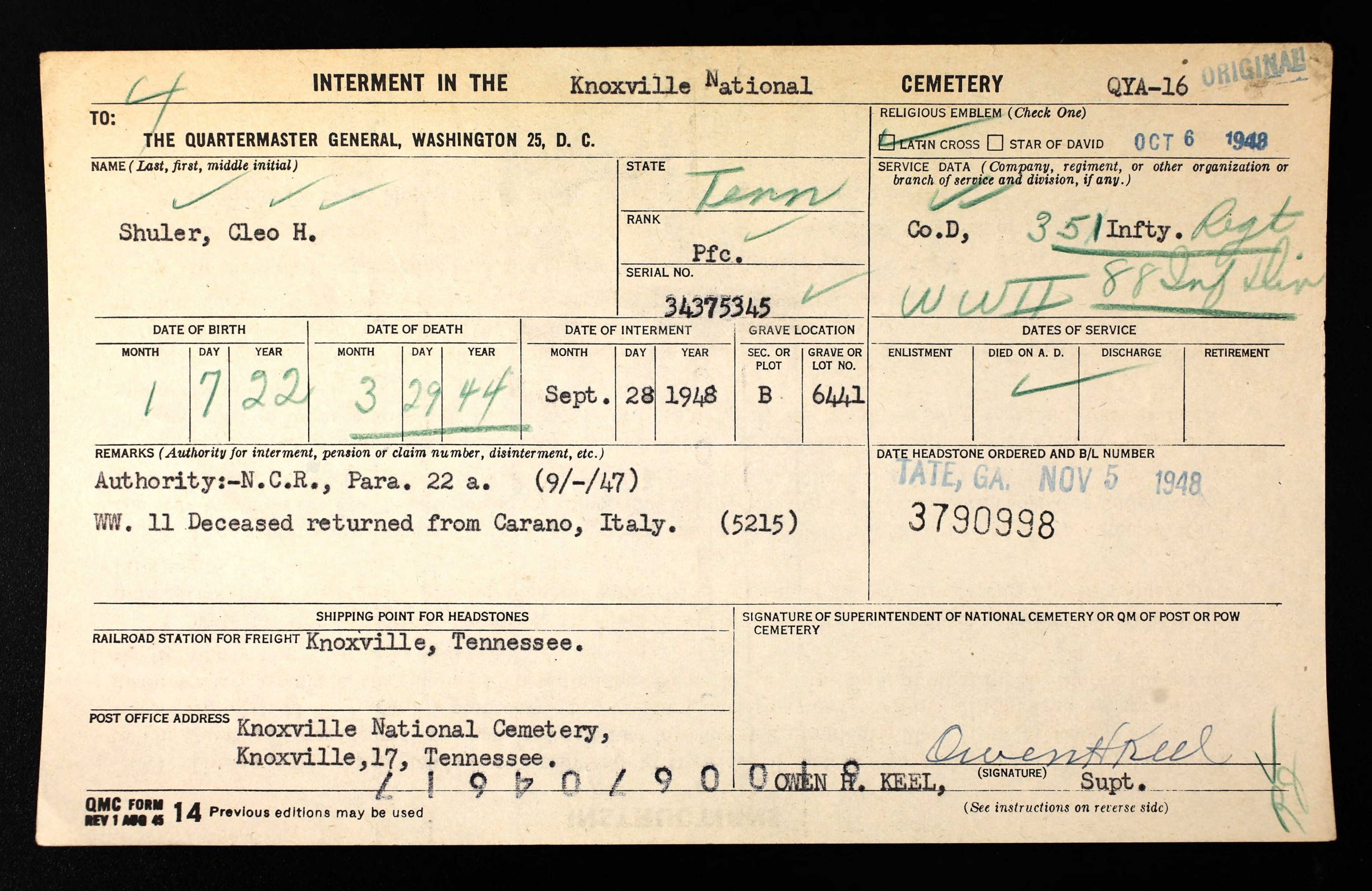 Cleo Shuler was returned from Carano, Italy. He was buried on September 28, 1948, in Knoxville National Cemetery (Section B Plot 6441).