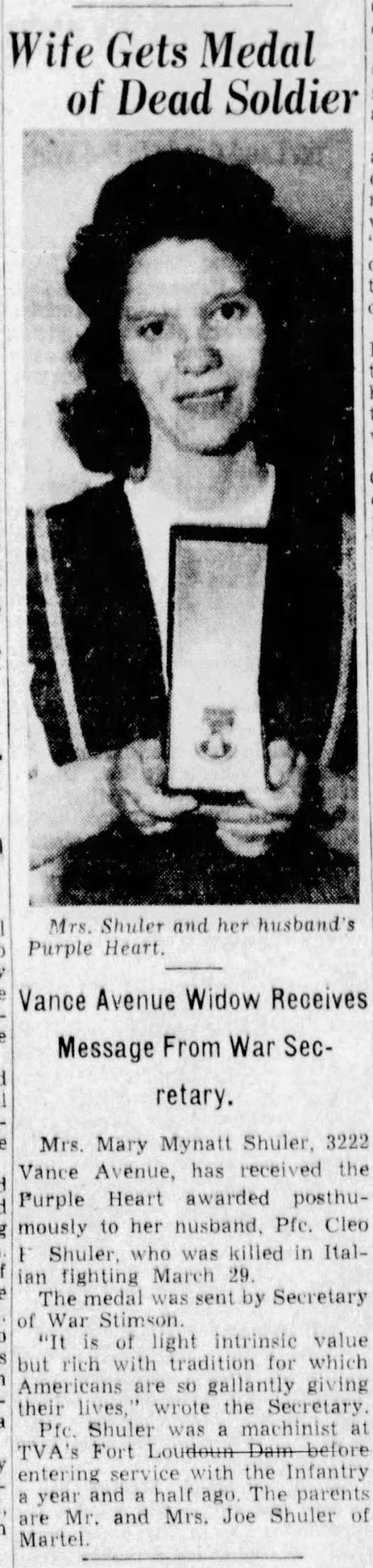 Mrs. Mary Mynatt Shuler, 3222 Dance Avenue, has received the Purple Heart awarded posthumously to her husband, Pfc. Cleo F. Shuler, who was killed in Italian fighting March 29.