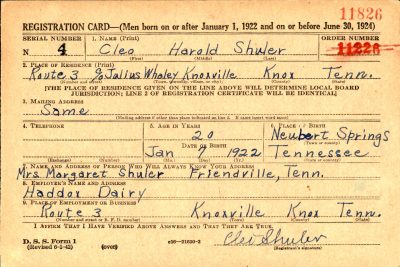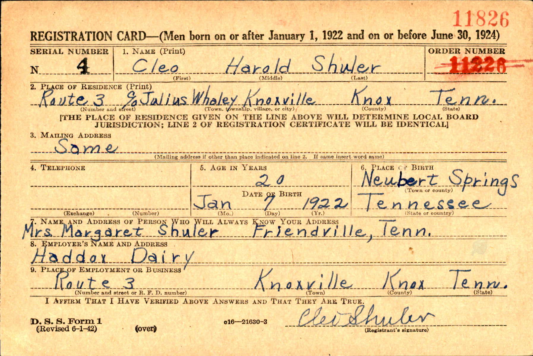 When Cleo Harold Shuler was born on January 7, 1922, in Neubert Springs, Tennessee , his father, Joseph, was 28 and his mother, Margaret, was 26. He married Mary Mynett on November 25, 1941, in Loudon, Tennessee. He died on March 29, 1944, at the age of 22.
