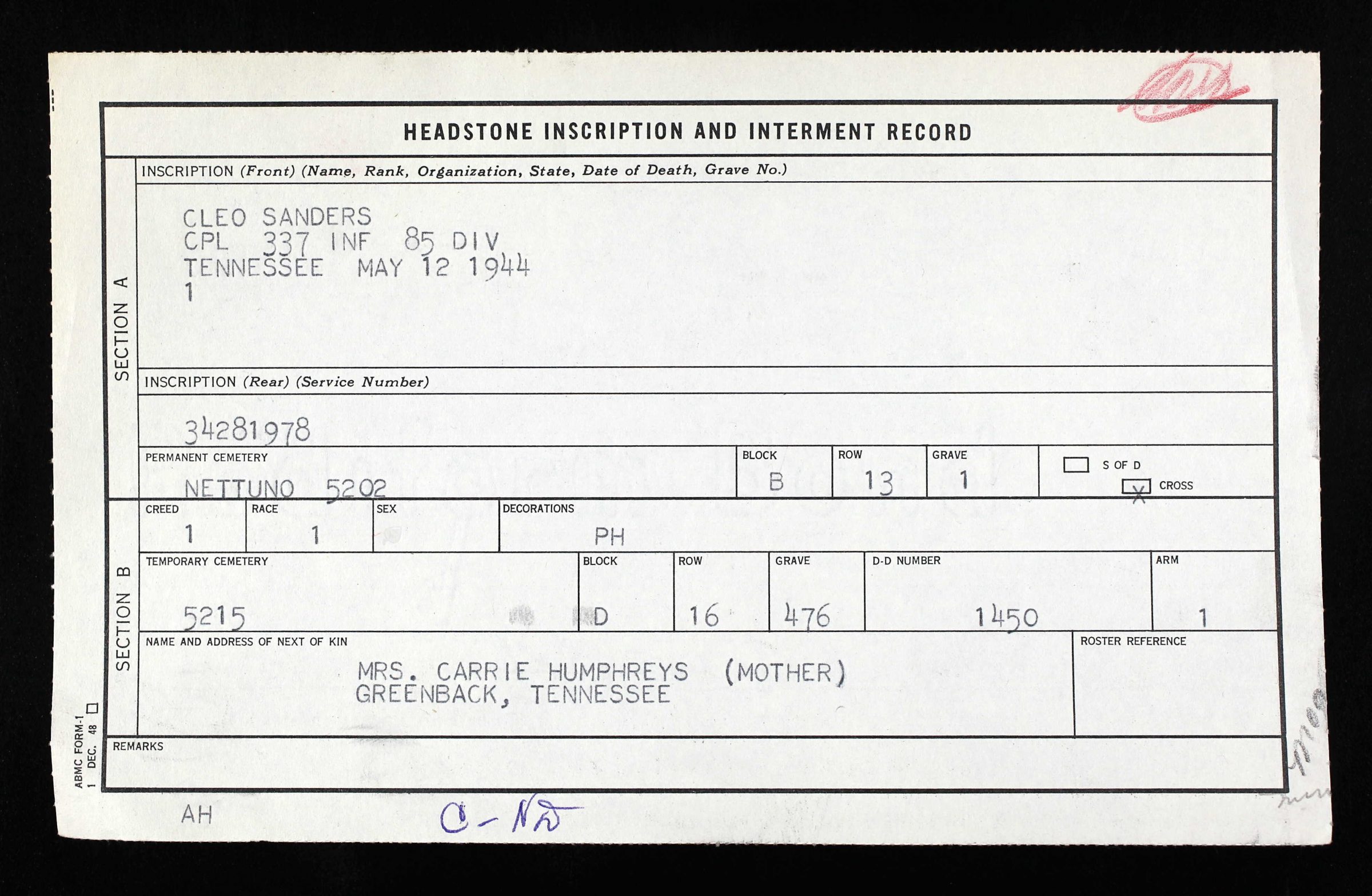 He was initially buried at Carano Cemetery at Carano, Italy and reburied at Nettuno Permanent Cemetery, Nettuno, Italy