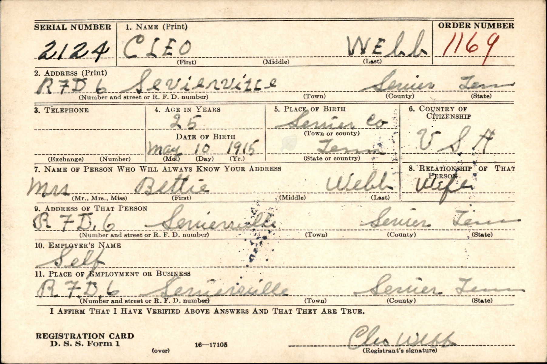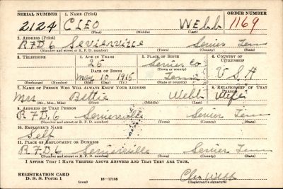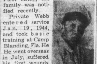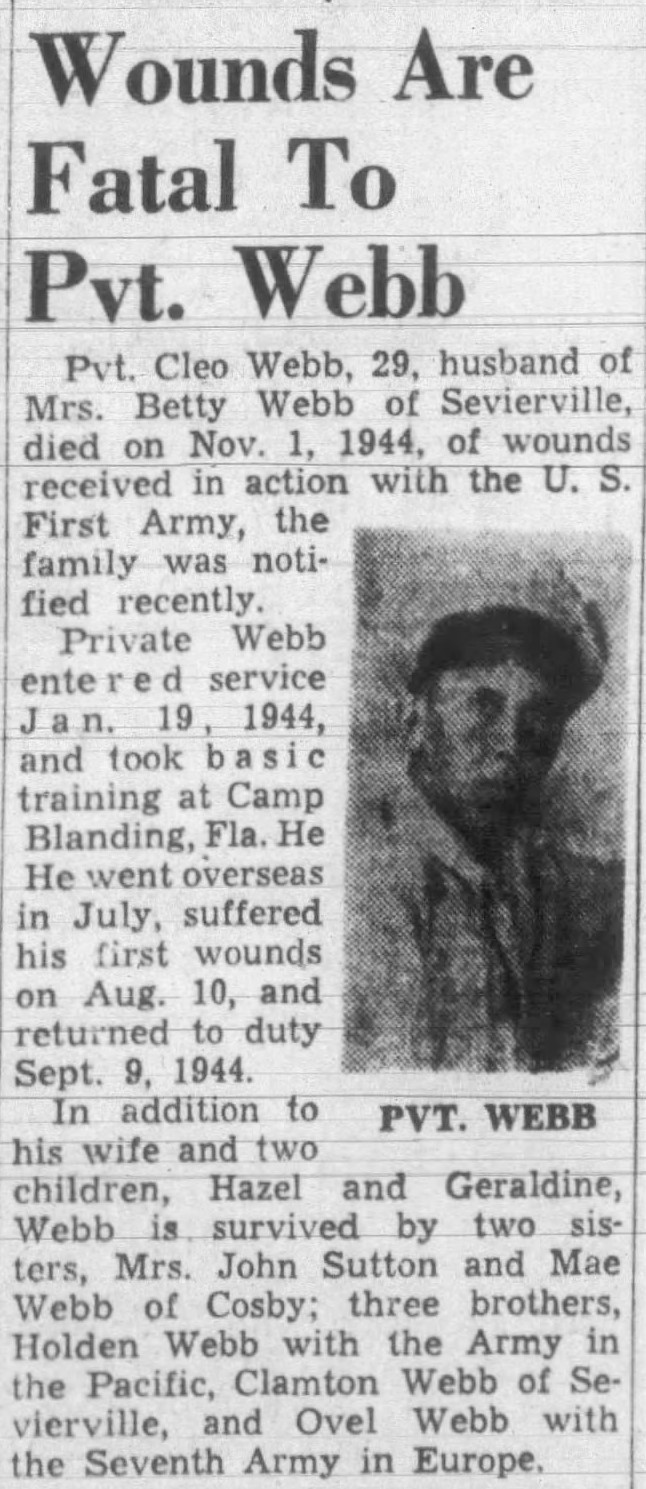 Pvt. Cleo Webb, 29, husband of Mrs. Betty Webb of Sevierville, died on Nov. 1, 1944, of wounds received in action with the U.S. First Army, the family was notified recently. Private Webb entered service Jan. 19, 1944, and took basic training at Camp Blanding, Fla. He went overseas in July, suffered his first wounds on Aug. 10, and returned to duty Sept. 9, 1944 In addition to his wife and two children, Hazel and Geraldine Webb, he is survived by two sisters, Mrs. John Sutton and Mae webb of Cosby; three brothers, Holden Webb with the Arm in the Pacific, Clamton Webb of Sevierville, and Ovel Webb with the Seventh Army in Europe.