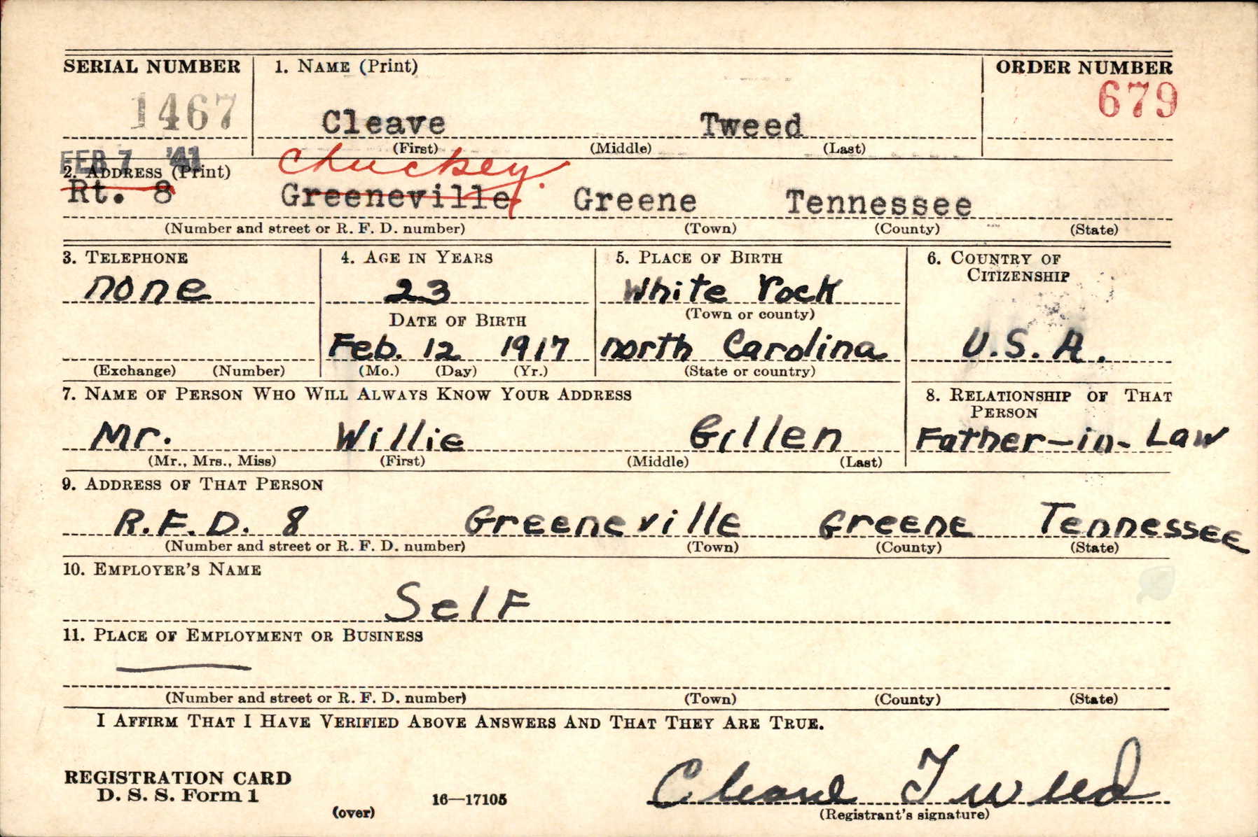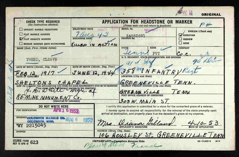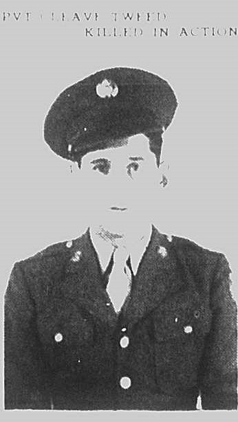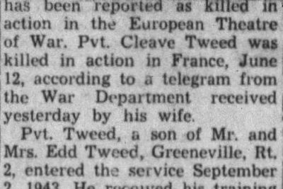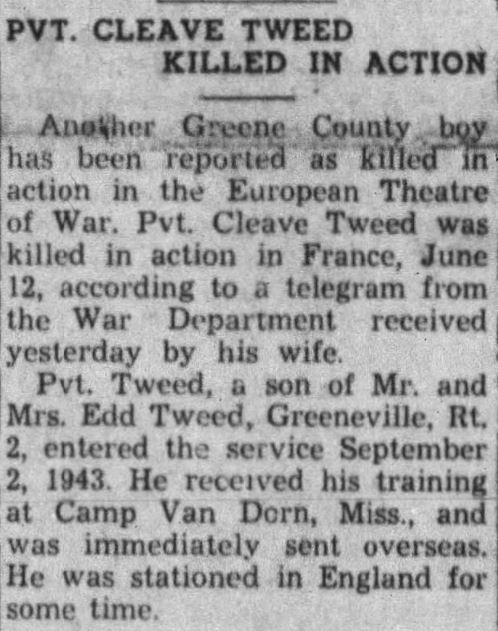 Another Greene County boy has been reported as killed in action in the European Theatre of War. Pvt. Cleave Tweed was killed in action in France, June 12, according to a telegram from the War Department received yesterday by his wife. Pvt. Tweed, a son of Mr. and Mrs. Edd Tweed, Greeneville, Rt. 2, entered the service September 2, 1943. He received his training at Camp Van Dorn, Miss., and was immediately sent overseas. He was stationed in England for some time.