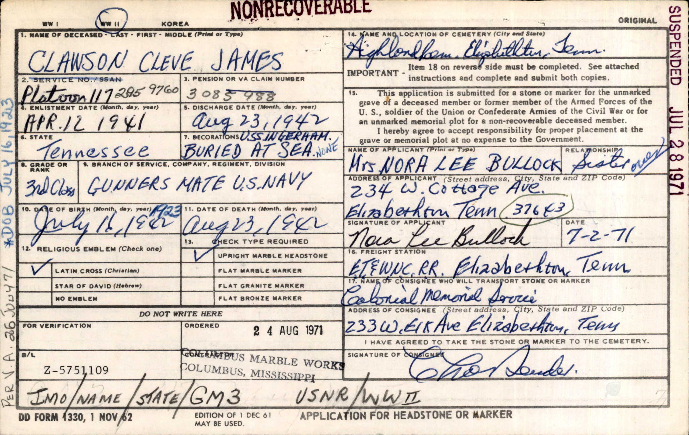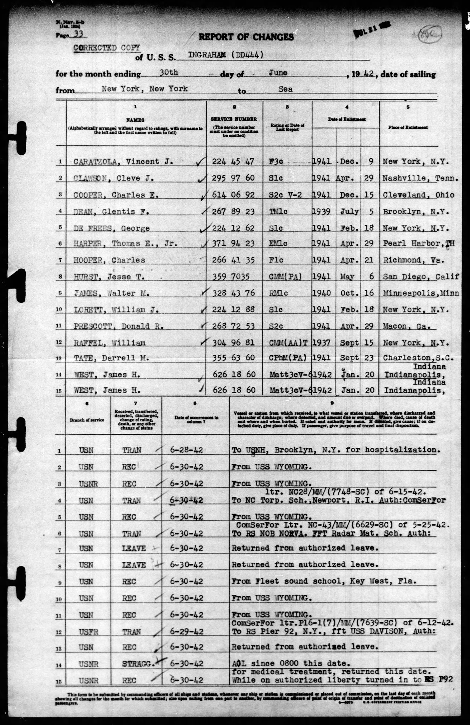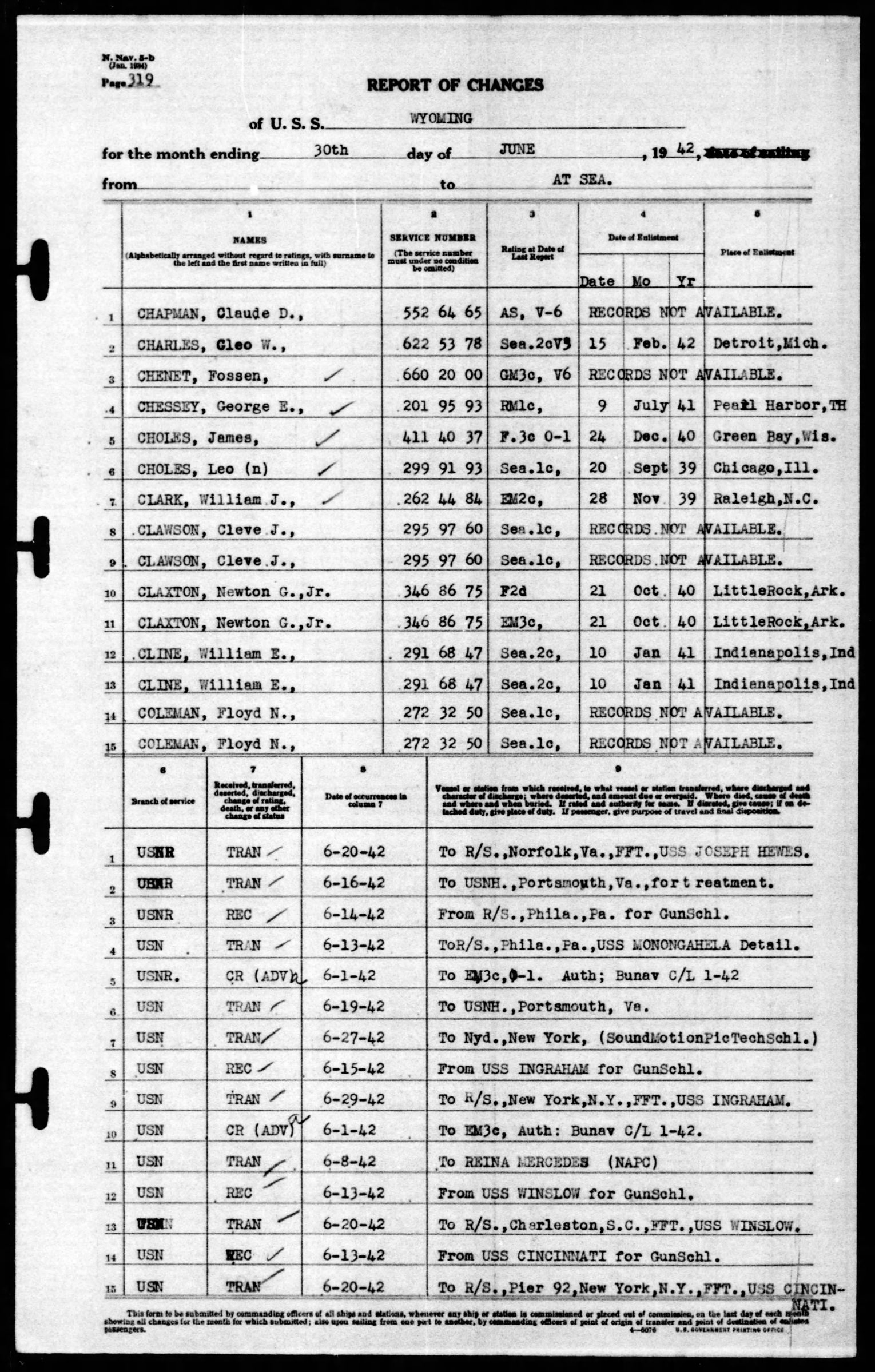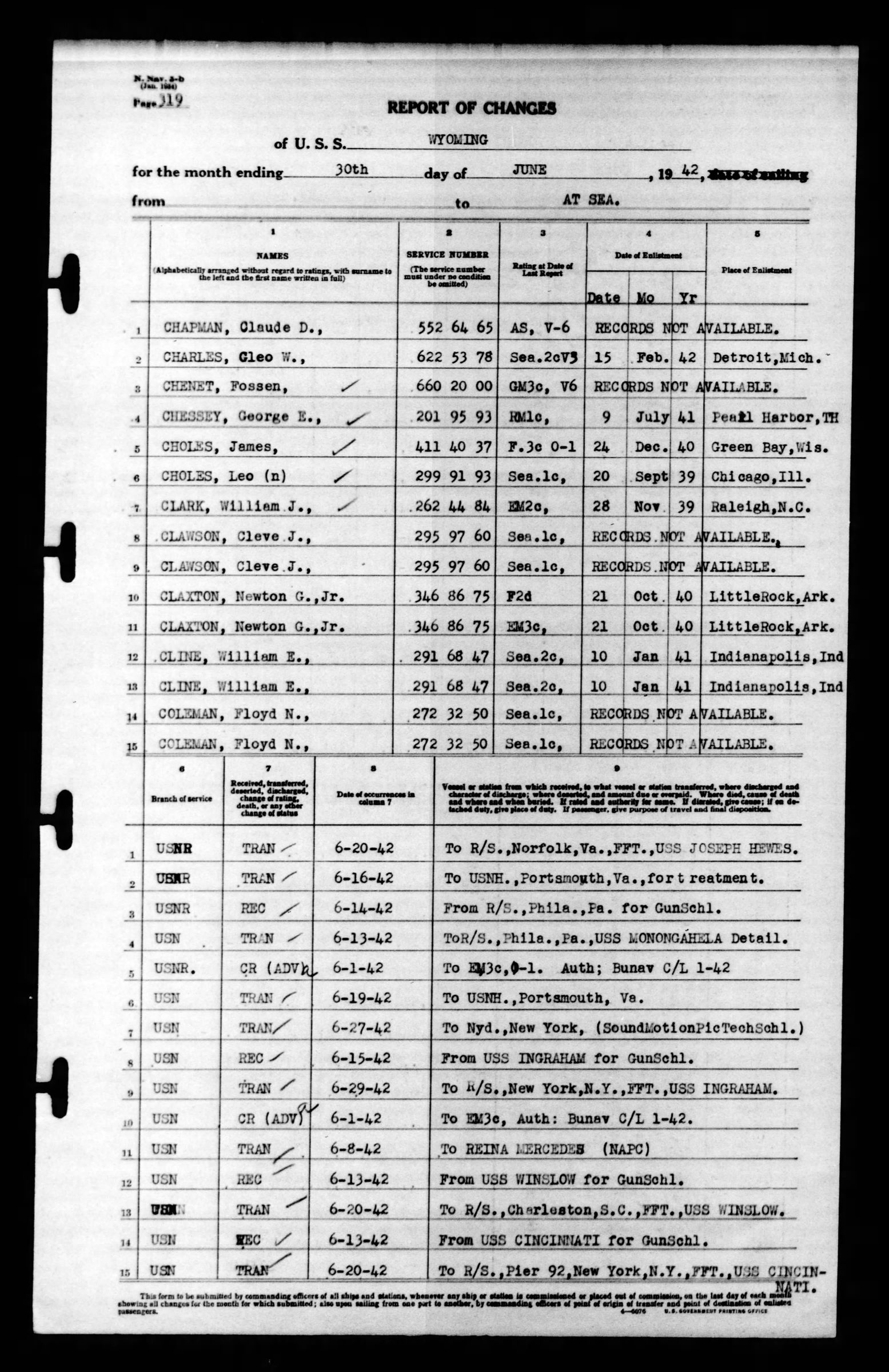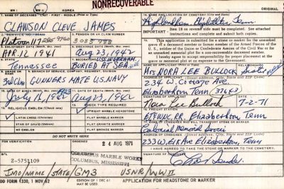 Gunners Mate 3rd Class Cleve James Lawson was transferred from the U.S.S. Ingraham to the U.S.S. Wyoming on 15 June 1942 for gun schooling and then transferred back to the U.S.S. Ingraham on 30 June 1942. He died on 22 August 1942 and was officially declared dead on 23 August 1943.