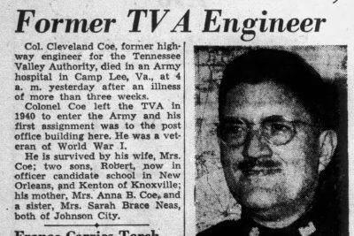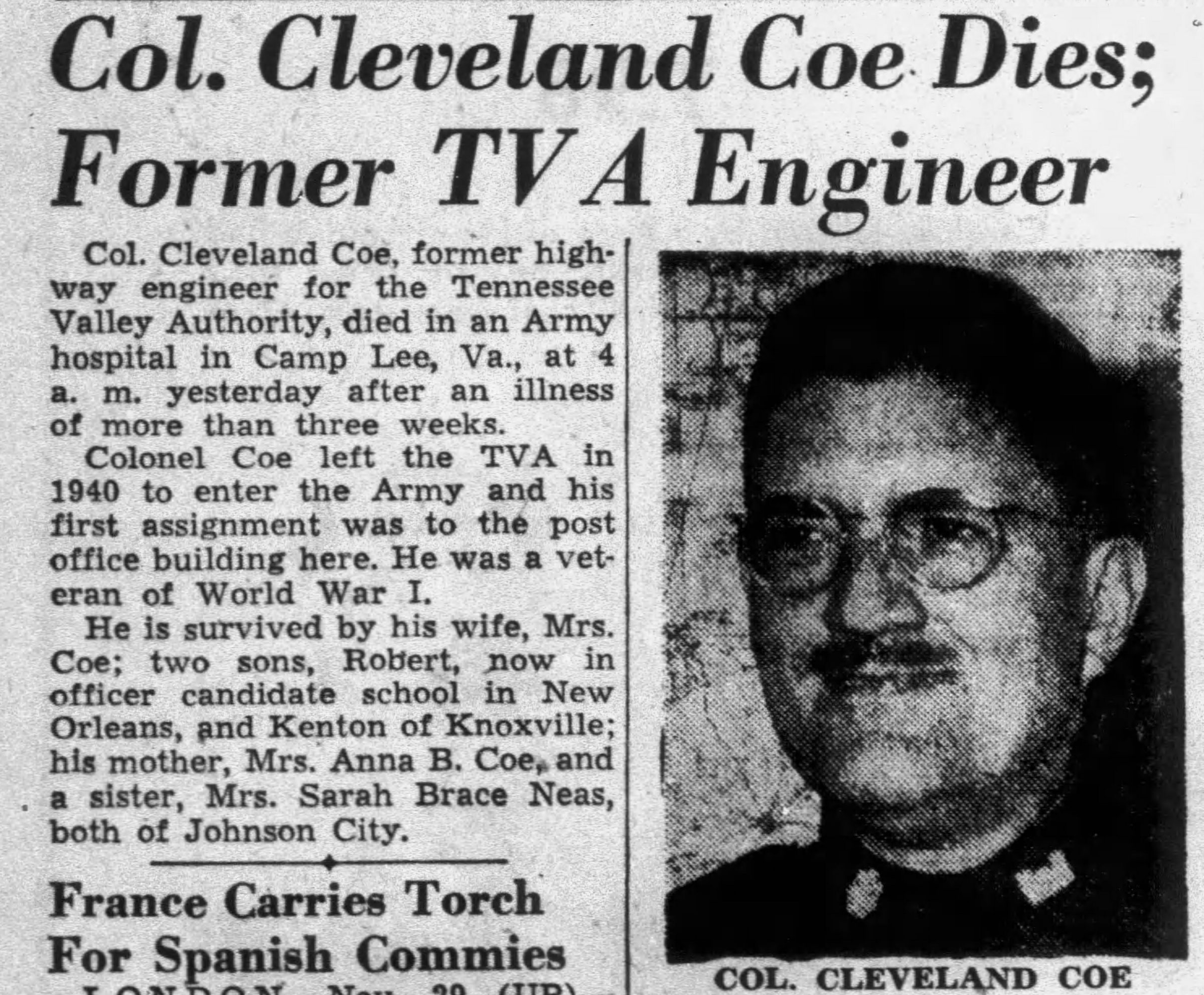 Col. Cleveland Coe, former highway engineer for the Tennessee Valley Authority, died in an Army hospital in Camp Lee, Va., at 4 a.m. yesterday after an illness of more than three weeks. Colonel Coe left the TVA in 1940 to enter the Army and his first assignment was to the post office building here. He was a veteran of World War I. He is survived by his wife, Mrs. Coe; two sons, Robert, now in officer candidate school in New Orleans, and Kenton of Knoxville; his mother, Mrs. Anna B. Coe and a sister, Mrs. Sarah Brace Neas, both of Johnson City.