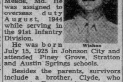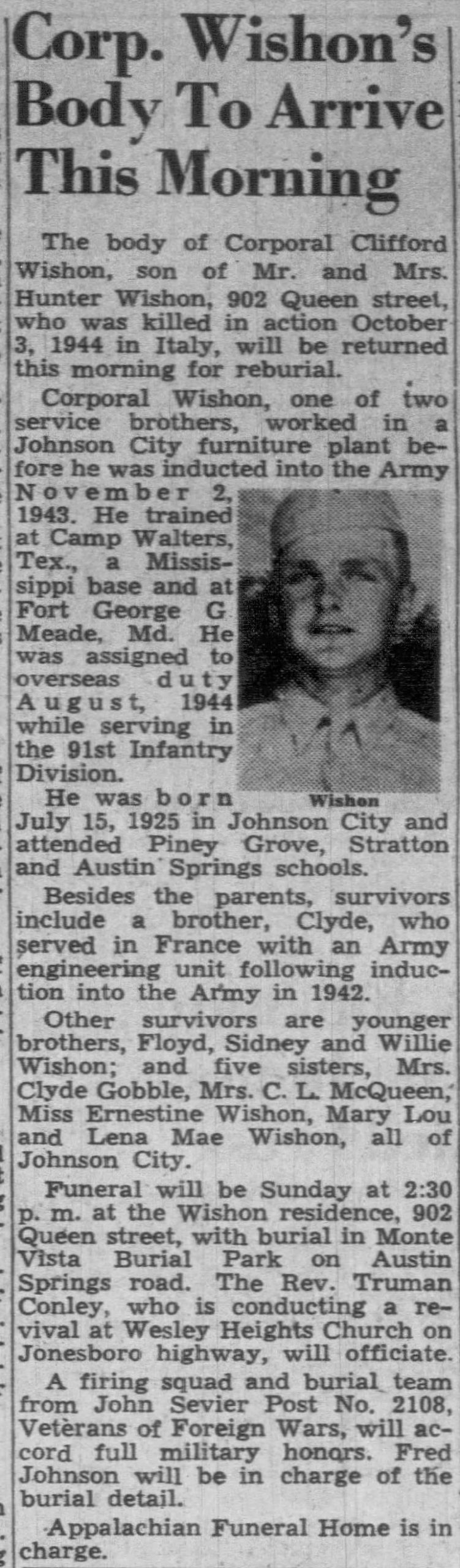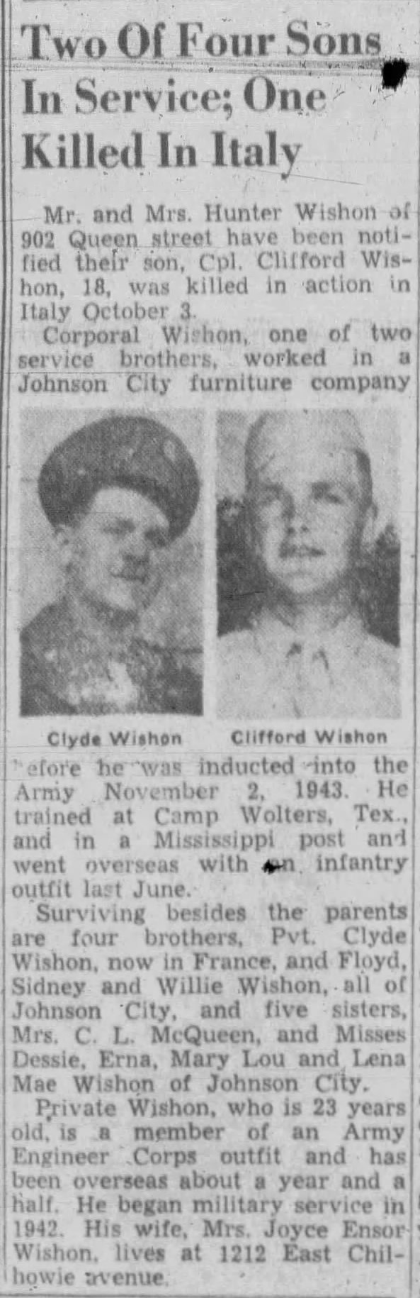 Mr. and Mrs. Hunter Wishon of 902 Queen street have been notified that their son, Cpl. Clifford Wishon, 18, was killed in action in Italy October 3. Corporal Wishon, one of two service brothers, worked in a Johnson City furniture company before he was inducted into the Army November 2, 1943. He trained at Camp Wolters, Tex., and in a Mississippipost and went overseas with an infantry outfit last June. Surviving besides the parents are four brothers, Pvt. Clyde Wishon, now in France, and Floyd, Sidney and Willie Wishon, all of Johnson City, and five sisters, Mrs. C.L. McQueen, and Misses Dessie, Erna, Mary Lou and Lena Mae Wishon of Johnson City. Private Wishon, who is 23 years old, is a member of an Army Engineer Corps outfit and has been overseas about a year and a half. He began military service in 1942. His wife, Mrs. Joyce Ensor Wishon, lives at 1212 East Chilhowie avenue.