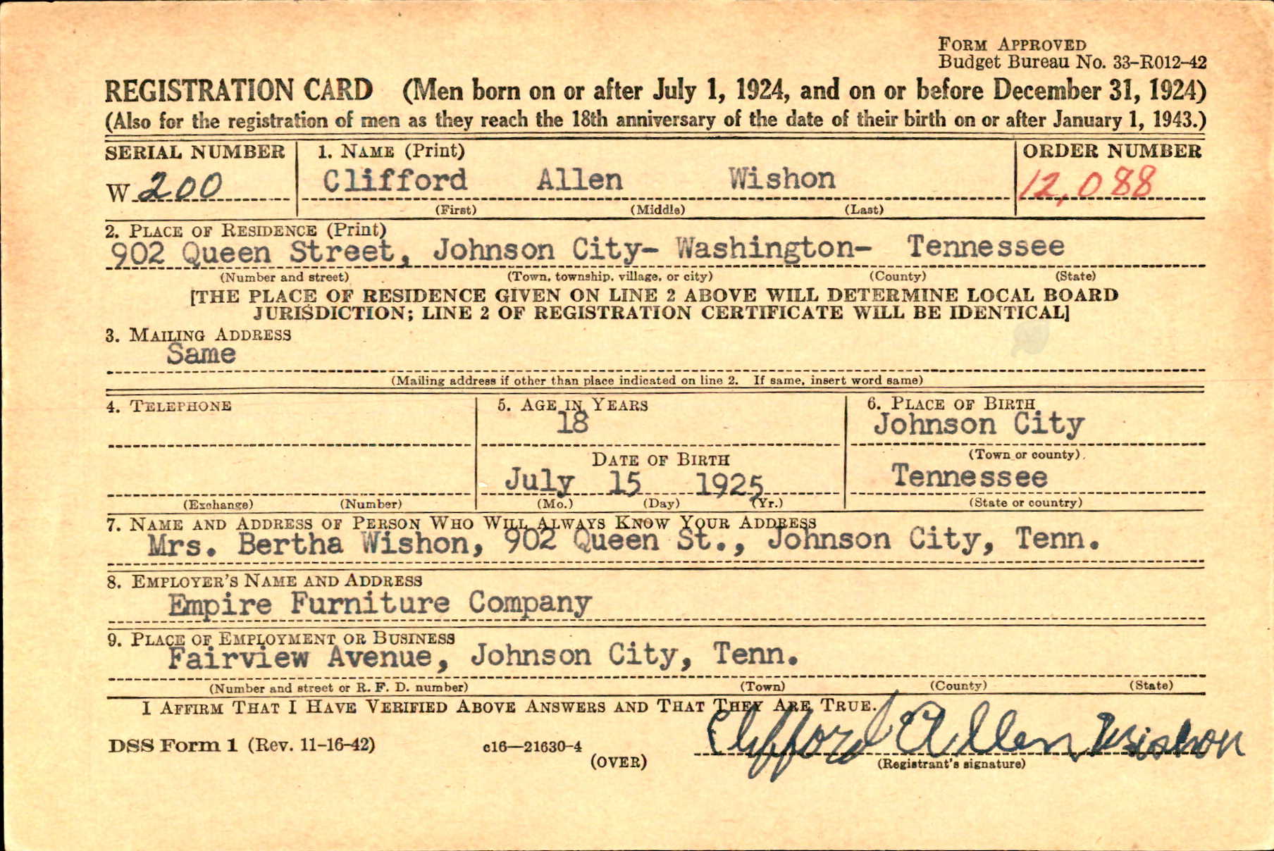 Clifford Allen Wishon was born in Johnson City, Tennessee, the son of Hunter Wishon and Bertha Mae Miller.