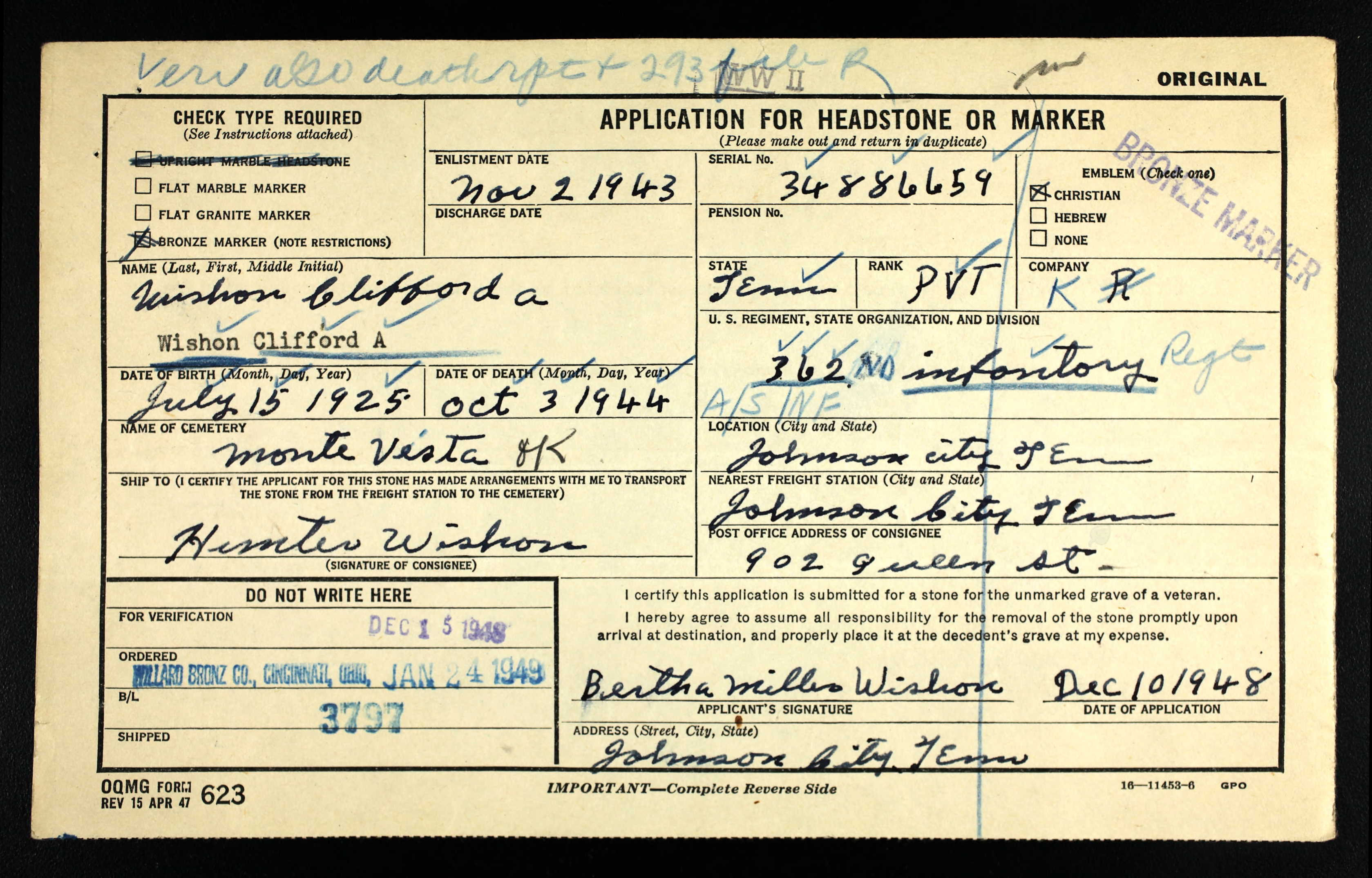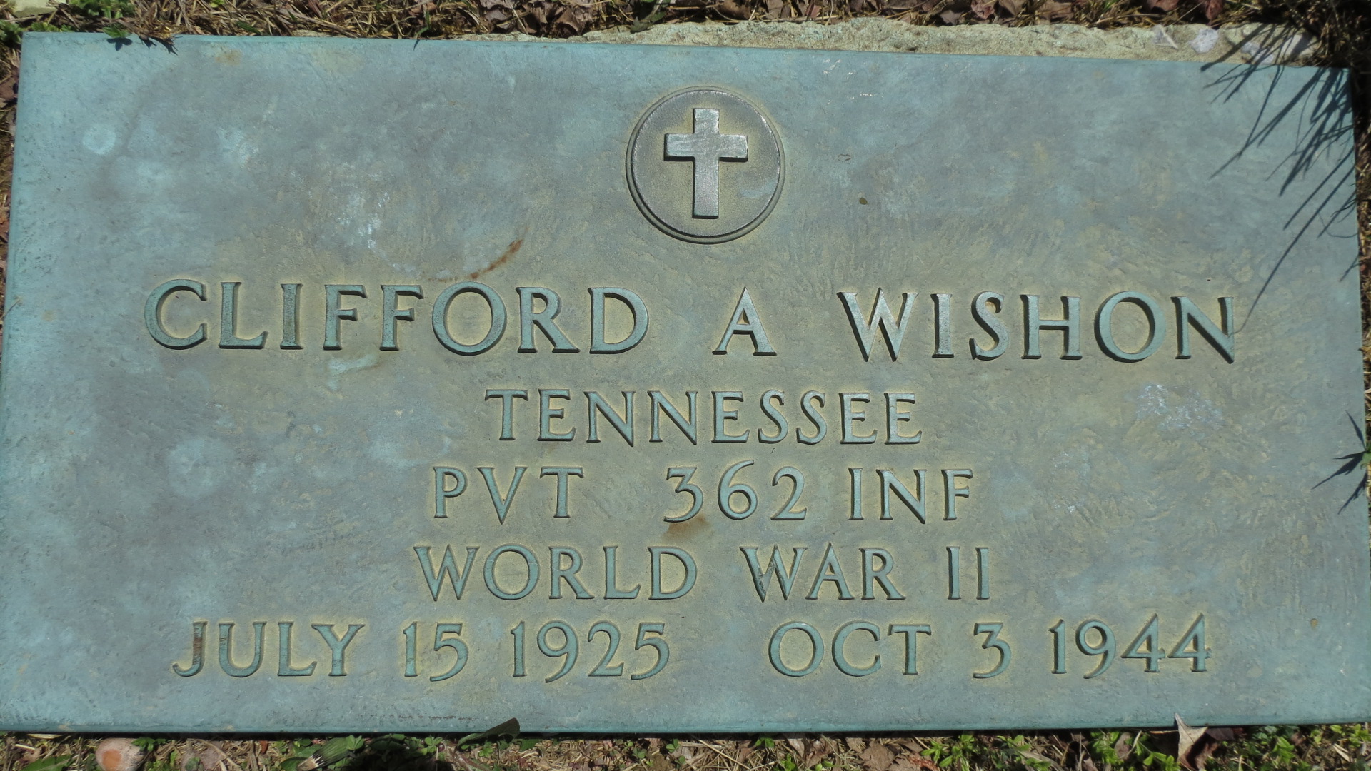 “Clifford was the 5th of eleven children. He was killed in action in Florence, Italy. He had been there just 3 weeks. He was buried in Italy until after the end of the war. His body was then returned to his family. They met his coffin at the train station and had a family burial. His parents were Grover Cleveland (Hunter) Wishon and Bertha Mae Miller Wishon, who are now buried there.”