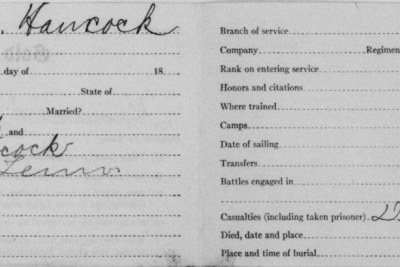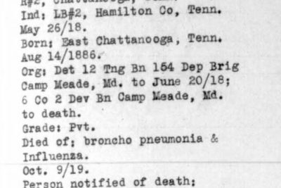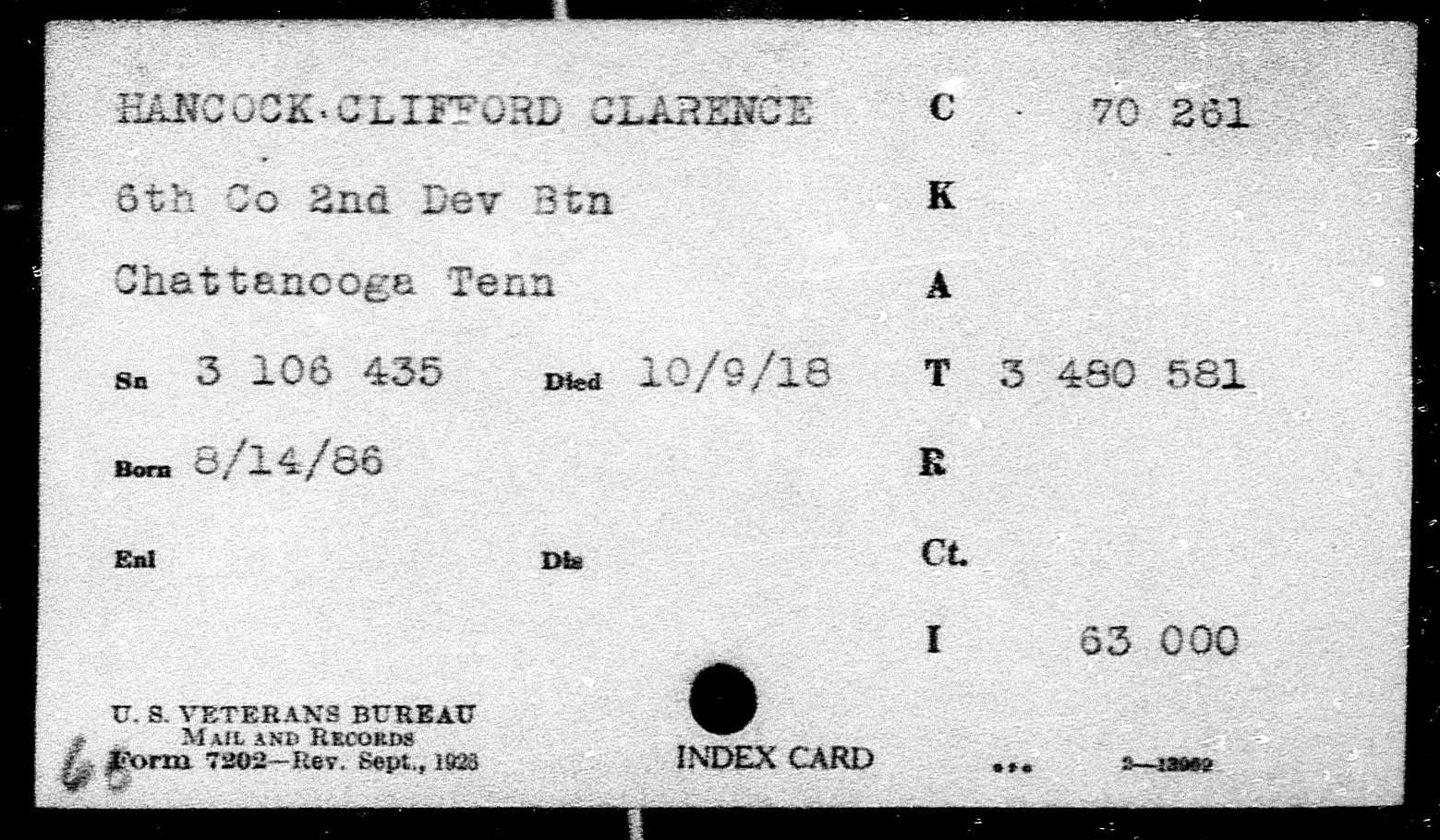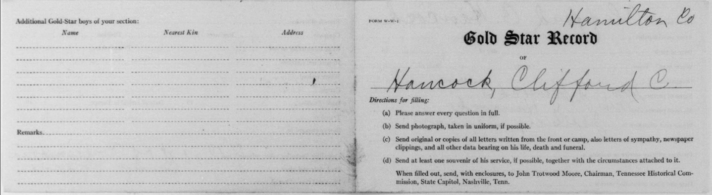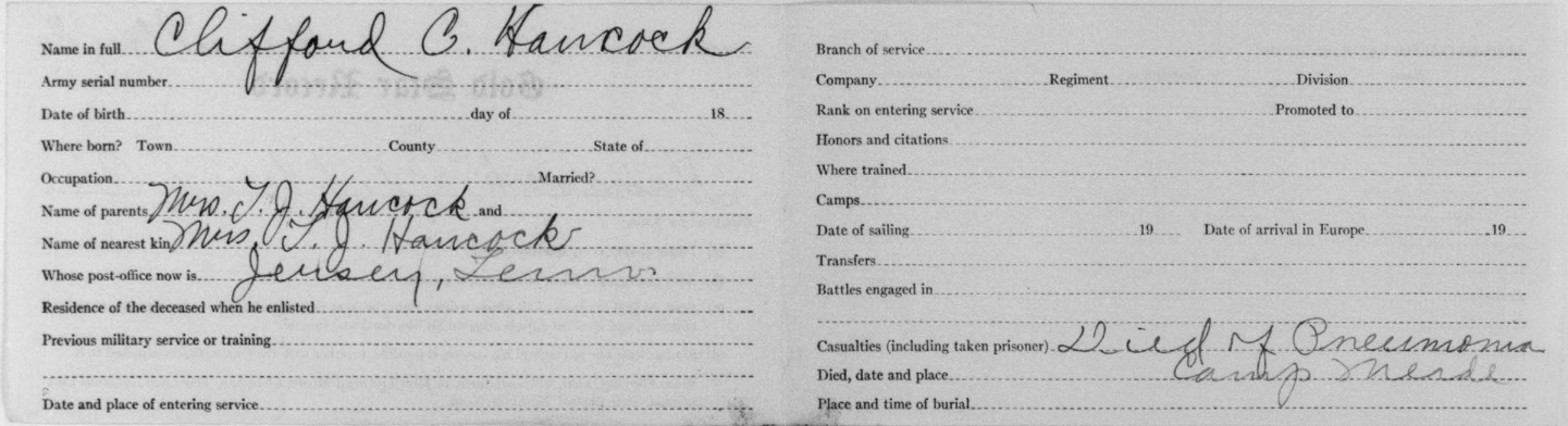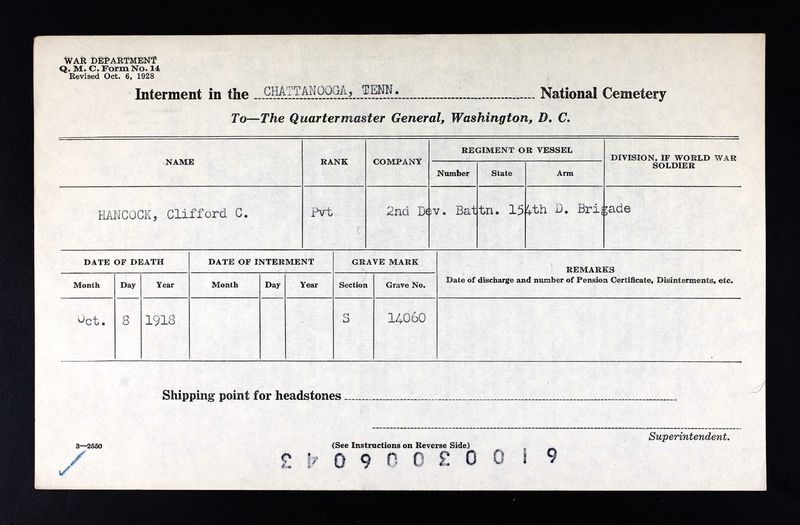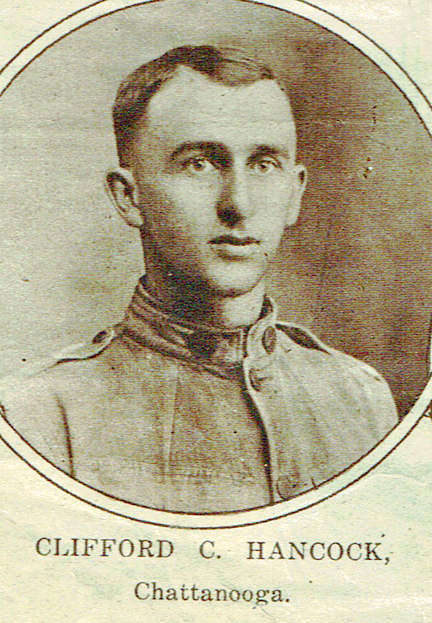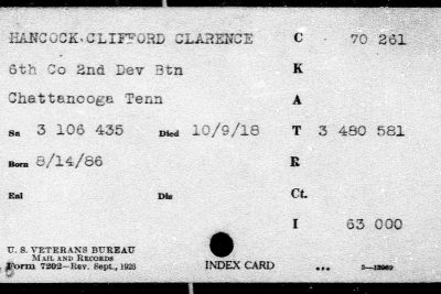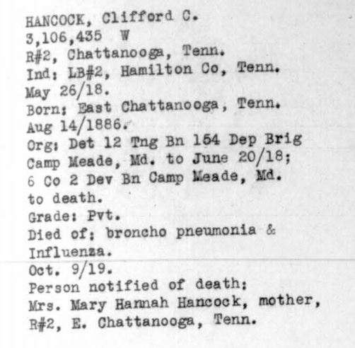 Clifford Clarence Hancock was born in 1896 in Chattanooga, Tennessee, son of Hannah Hancock. He was inducted at Hamilton County, TN on 26 May 1918. He died 8 October 1918 of broncho pneumonia.