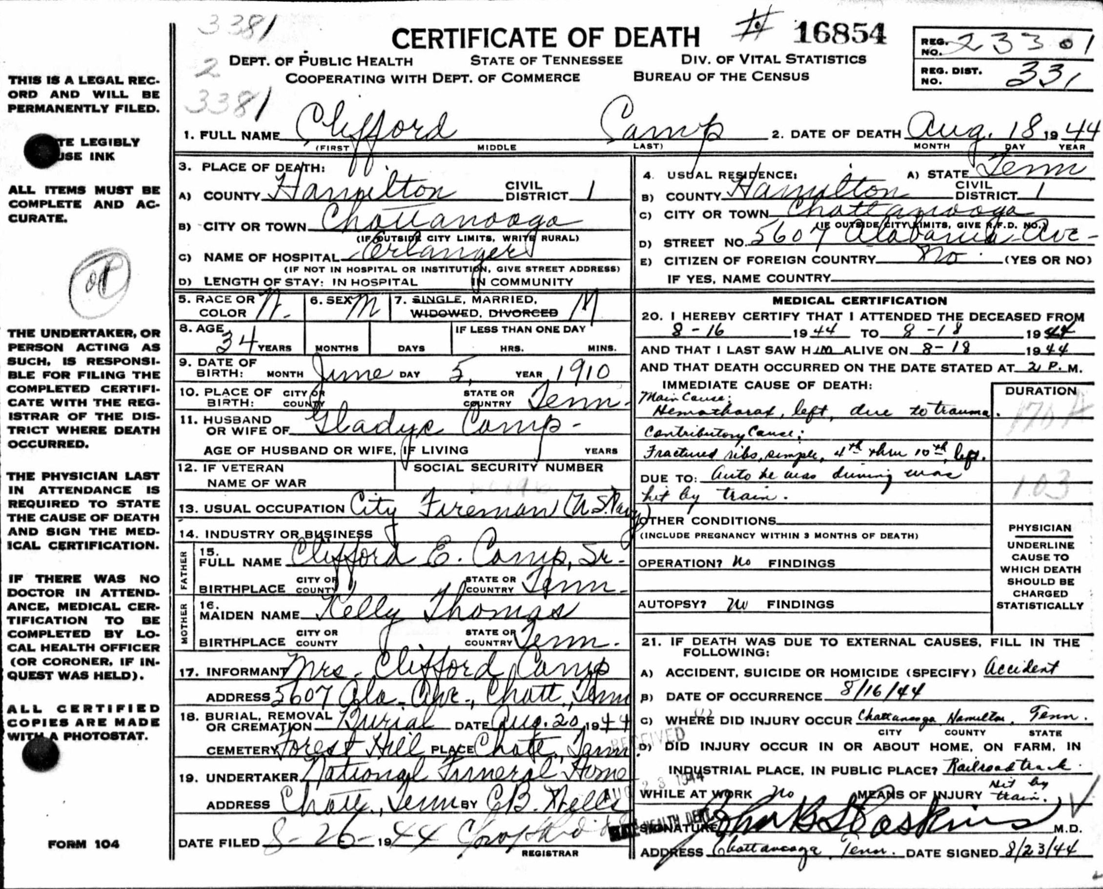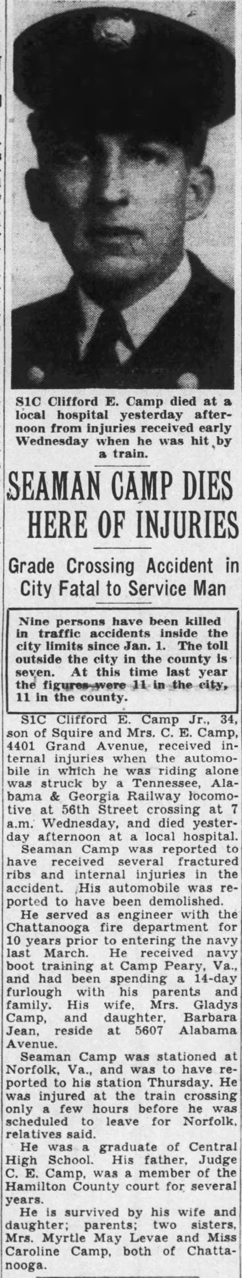 S1C Clifford E. Camp Jr., 34, son of Squire and Mrs. C.E.Camp, 4401 Grand Avenue, received internal injuries when the automobile in which he was riding alone was struck by a Tennessee, Alabama & Georgia Railway locomotive at 56th Street crossing at 7 a.m. Wednesday, and died yesterday afternoon at a local hospital. Seaman Camp was reported to have received several fractured ribs and internal injuries in the accident. His automobile was reported to have been demolished. He served as engineer with the Chattanooga fire department for 10 years prior to entering the navy last March. He received navy boot training at Camp Peary, Va., and had been spending a 14-day furlough with his parents and family. His wife, Mrs. Gladys Camp, and daughter, Barbara Jean, reside at 5607 Alabama Avenue. Seaman Camp was stationed at Norfolk, Va., and was to have reported to his station Thursday. He was injured at the train crossing only a few hours before he was scheduled to leave for Norfolk, relatives said. He was a graduate of Central High School. His father, Judge C.E. Camp, was a member of the Hamilton County court for several years. He is survived by his wife and daughter; parents; two sisters, Mrs. Myrtle May Levae and Miss Caroline Camp, both of Chattanooga.