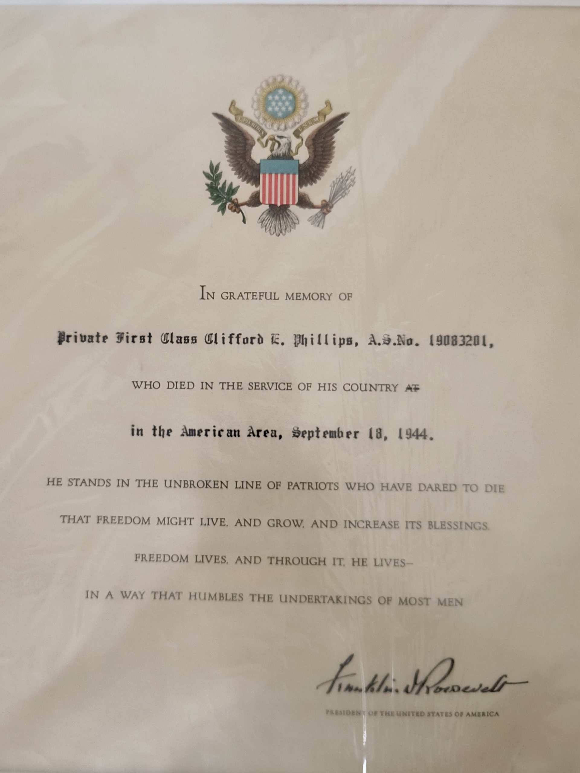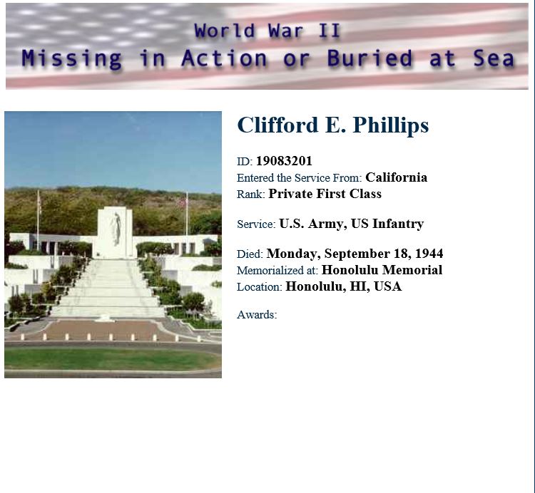 Pfc. Clifford E. Phillips (Buster) was my uncle. He was my mom’s oldest brother and 2nd oldest if 13 children, my mom Carolyn Sue Phillips, being the youngest. She was 5 years old when he passed away. I have the original certificate that was sent to my grandparents from the U. S. Government that says in grateful memory of… It is signed by President Roosevelt at the bottom. This certificate was given to my mom by her parents and then given to me. A photograph of the certificate is found below. Thank you!