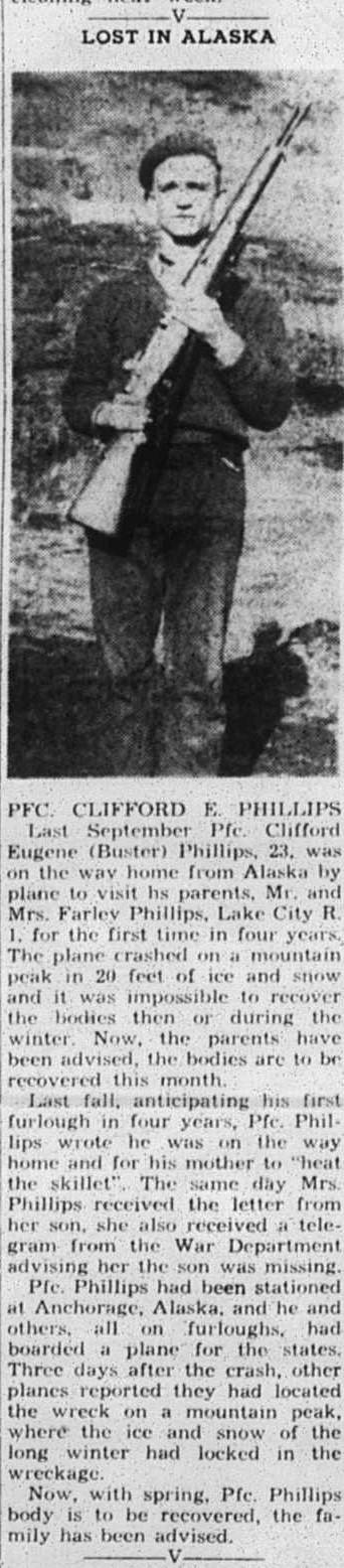 Last September Pfc. Clifford Eugene (Buster) Phillips. 23, was on the way home from Alaska by plane to visit his parents, Mr. and Mrs. Farley Phillips, Lake City, R.1 for the first time in four years. The plane crashed on a mountain peak in 20 feet of ice and snow, and it was impossible to recover the bodies then or during the winter. Now, the parents have been advised, the bodies are to be recovered this month. Last fall, anticipating his first furlough, he was on the way home and for his mother to “heat the skillet”. The same day Mrs. Phillips received the letter from her son, she also received a telegram from the War Department advising her the son was missing. Pfc. Phillips had been stationed at Anchorage, Alaska, and he and others, all on furloughs, had boarded a plane for the states. Three days after the crash, other planes reported they had located the wreck on a mountain peak, where the ice and snow of the long winter had locked in the wreckage. Now, with spring, Pfc. Phillips body is to be recovered, the family has been advised.