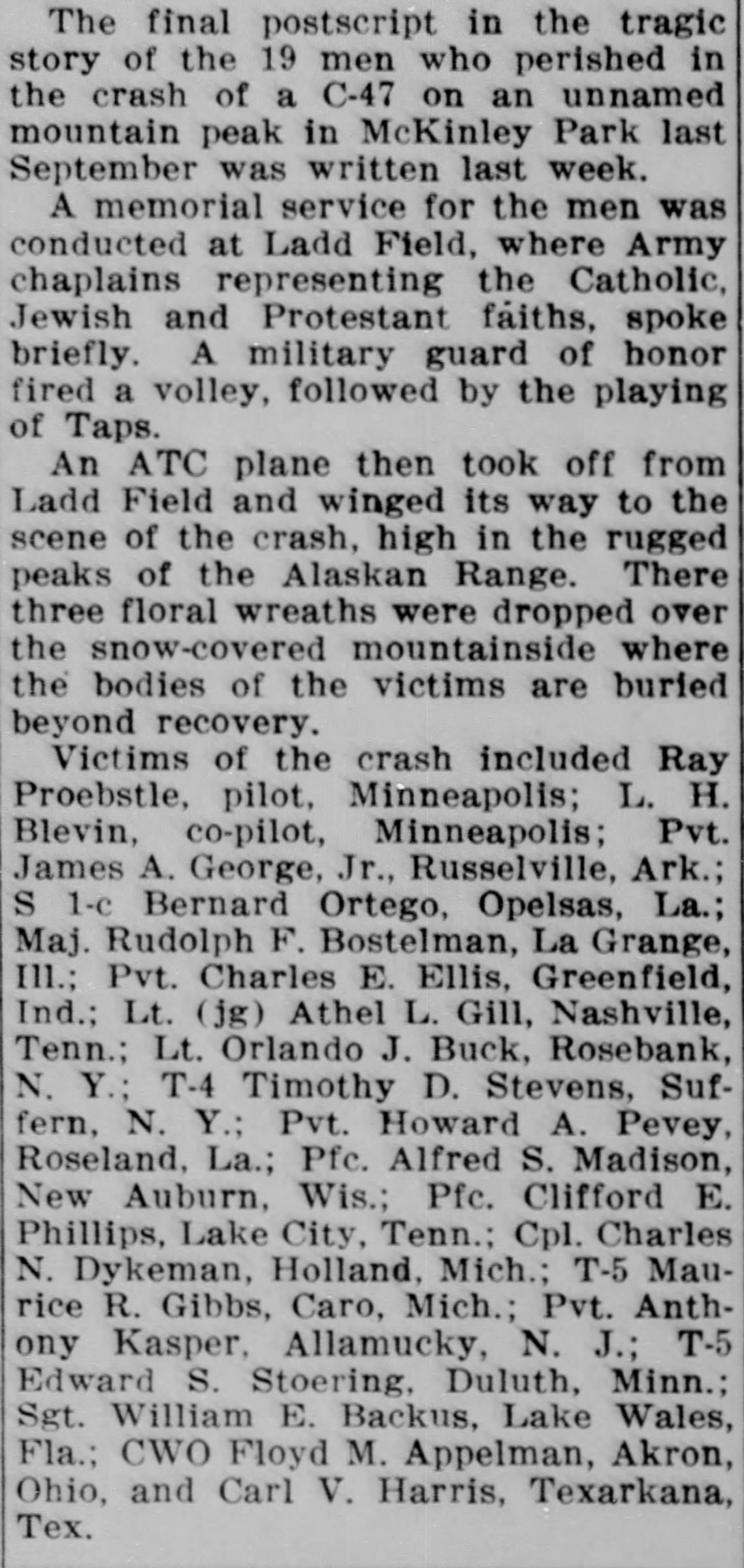 A memorial service for the men was conducted at Ladd Field, where Army chaplains representing the Catholic, Jewish and Protestant faiths, spoke briefly. A military guard of honor fired a volley, followed by playing of Taps. An ATC plane then took off from Ladd Field and winged its way to the scene of the crash, high in the rugged peaks of the Alaskan Range. There three floral wreaths were dropped over the snow-covered mountainside where the bodies of the victims are buried beyond recovery.