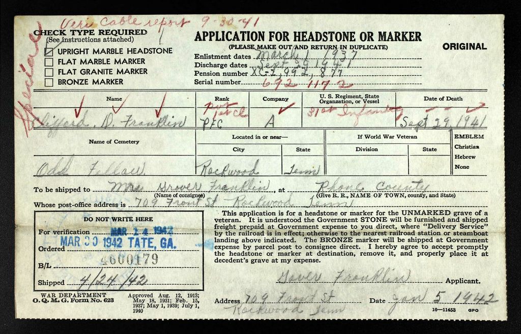 Private First Class Clifford Franklin was born in 1918, the son of John Grover Franklin and Martha Hall. He died non battle on 29 September 1941 in the Philippines. His headstone reads: TN Pvt 1C1 31 Inf