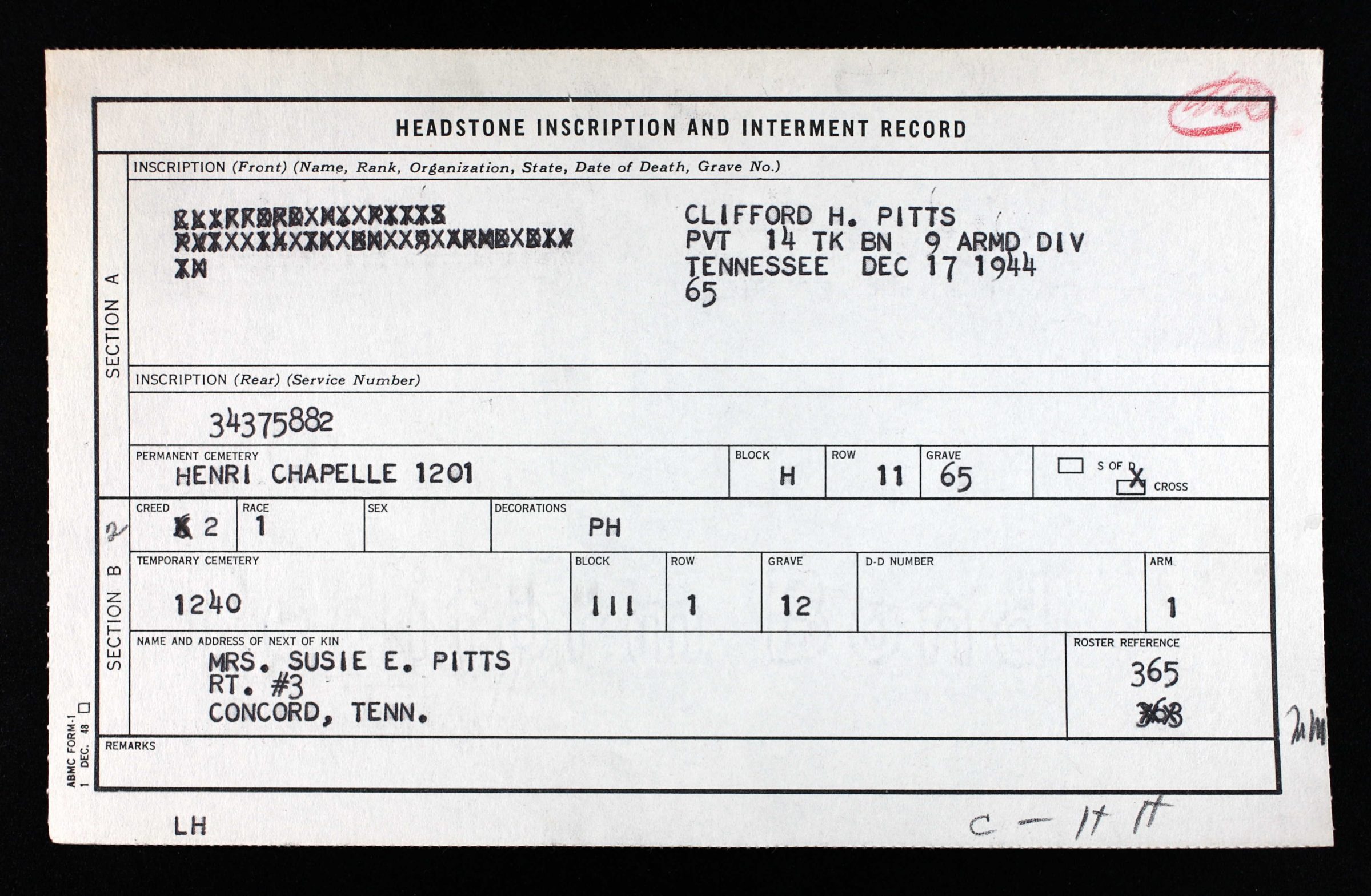 I would like to retrieve as much information as possible concerning the PVT CLIFFORD H. PITTS in order to maintain a duty of remembrance and take care of his grave regularly.