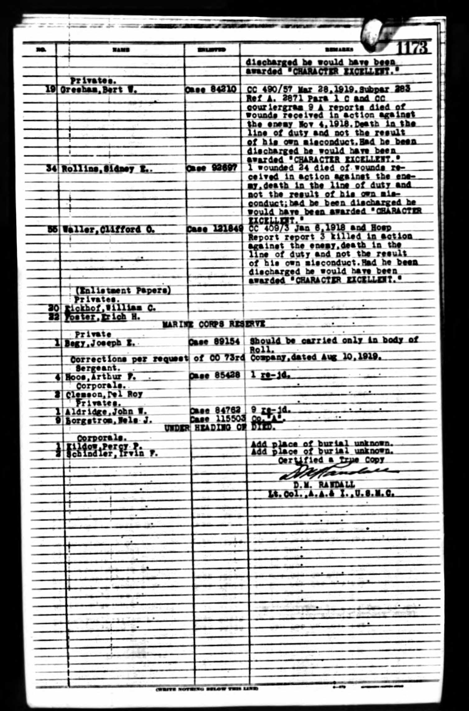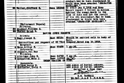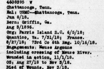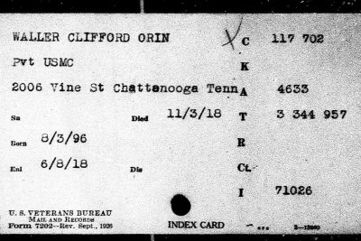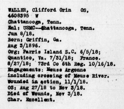 Funeral services over the remains of Clifford Orin Waller, a private in the Seventy-third company, Sixth marines, U.S.A., who died in France Nov. 3, 1917, were held Sunday morning at Griffin, Ga., in the First Methodist church of that city. High military and civic honors were paid the gallant young Georgian, who is a son of Mrs. Susie J.L. Waller, a resident of Lake View near Rossville. The Rev. J. Marion Stafford, pastor of the First Presbyterian church of Griffin, and who served some months in the World war, preached the funeral sermon and paid a high triburte to the young soldier. Young Waller was a charter membeer of the first troop of Boy Scouts organized in Georgia. Member of this troop acted as pallbearers. Member of the American Legion, Confederate veterans and fraternal orders attended the services. The young soldiers is survived by his mother, two brothers, J. Kelly Waller, of Macon, Ga., and C.H. Waller, of Rossville, and one sister, Miss Agnes Waller of Lake View.
