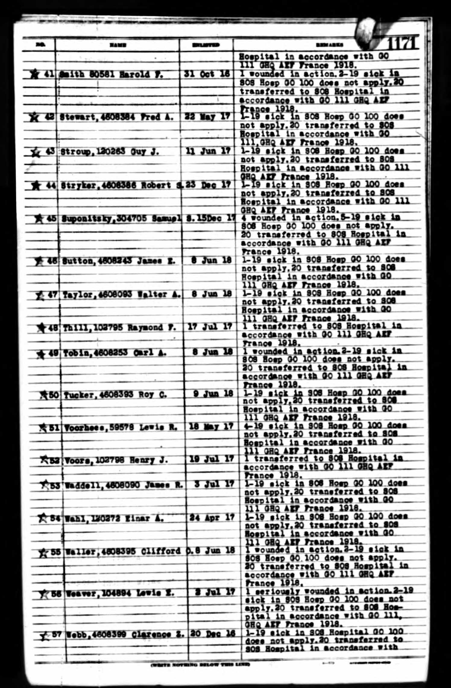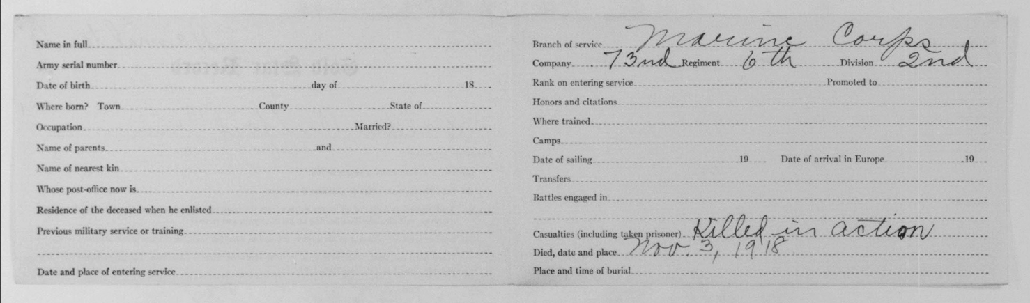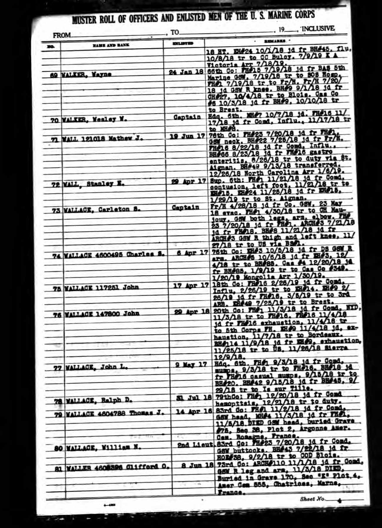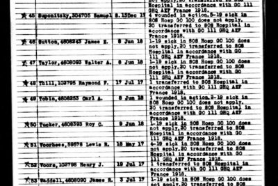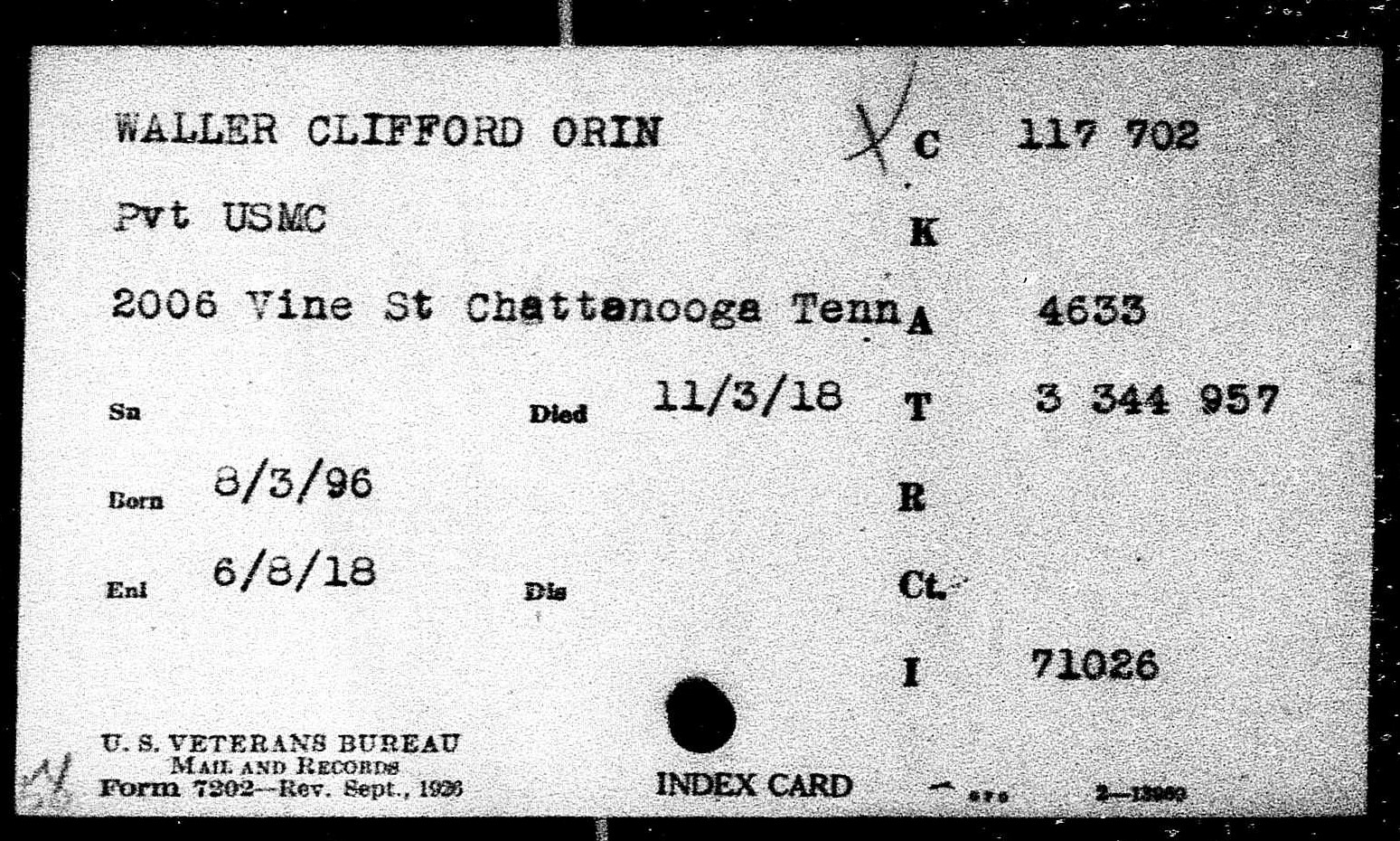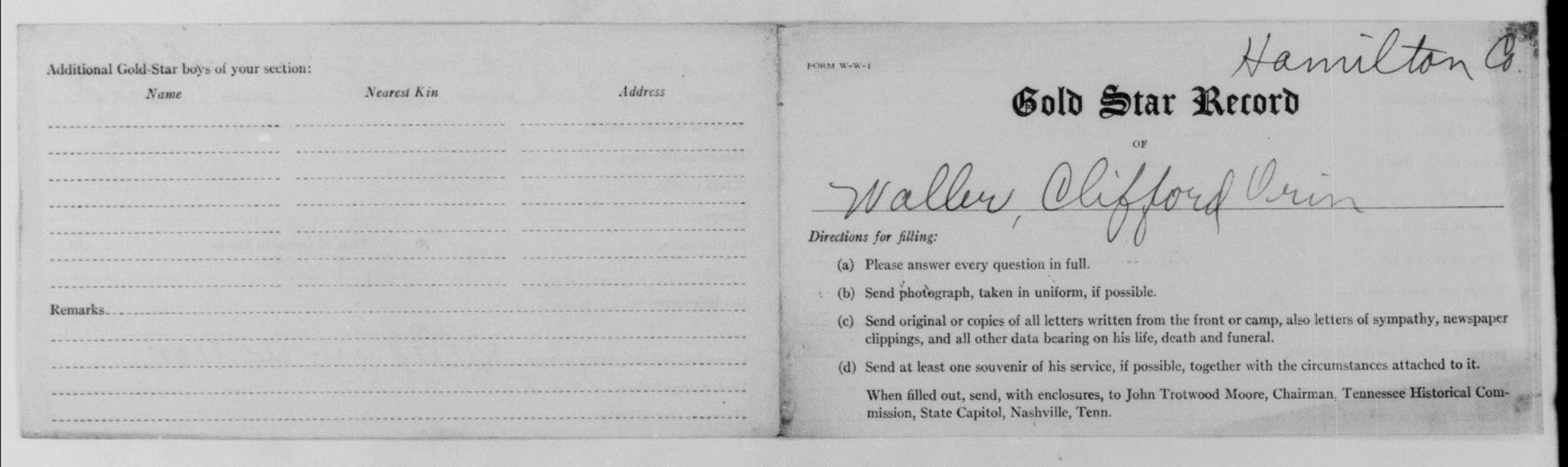 Clifford Orin Waller was born 1896 in Griffin, Georgia to John W. Waller and Susan Jarrett Lynch Waller. He enlisted on 8 June 1918. He was wounded in action on 1 November 1918, on the right leg and arm and was transferred to SOS Hospital in France. He was initially buried at the American Cemetery 555, Chatrices, Marne, France.