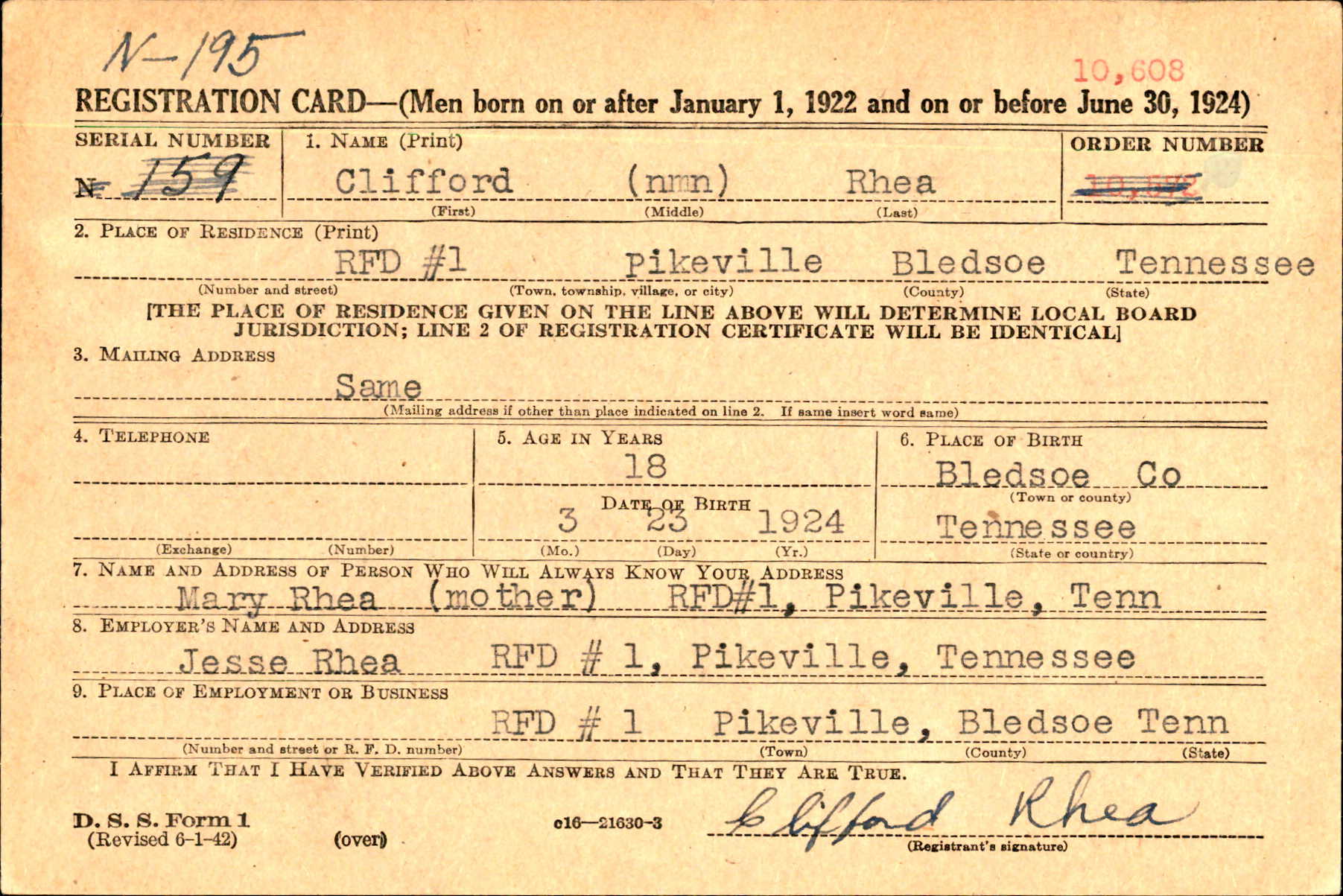 Parents: Mr. and Mrs. Jess Rhea, Rt 1, Pikeville, TN
