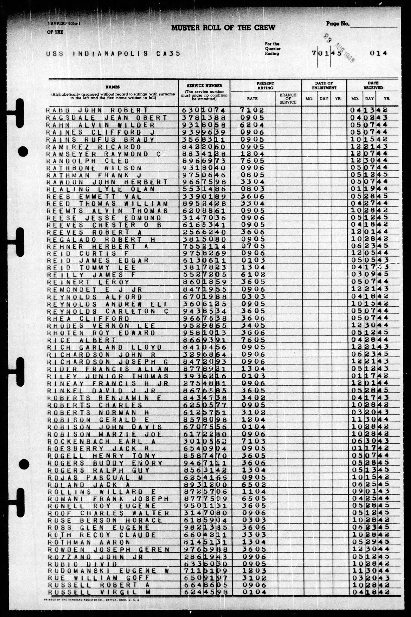 - Division/Assignment: USS Indianapolis (CA-35)