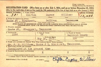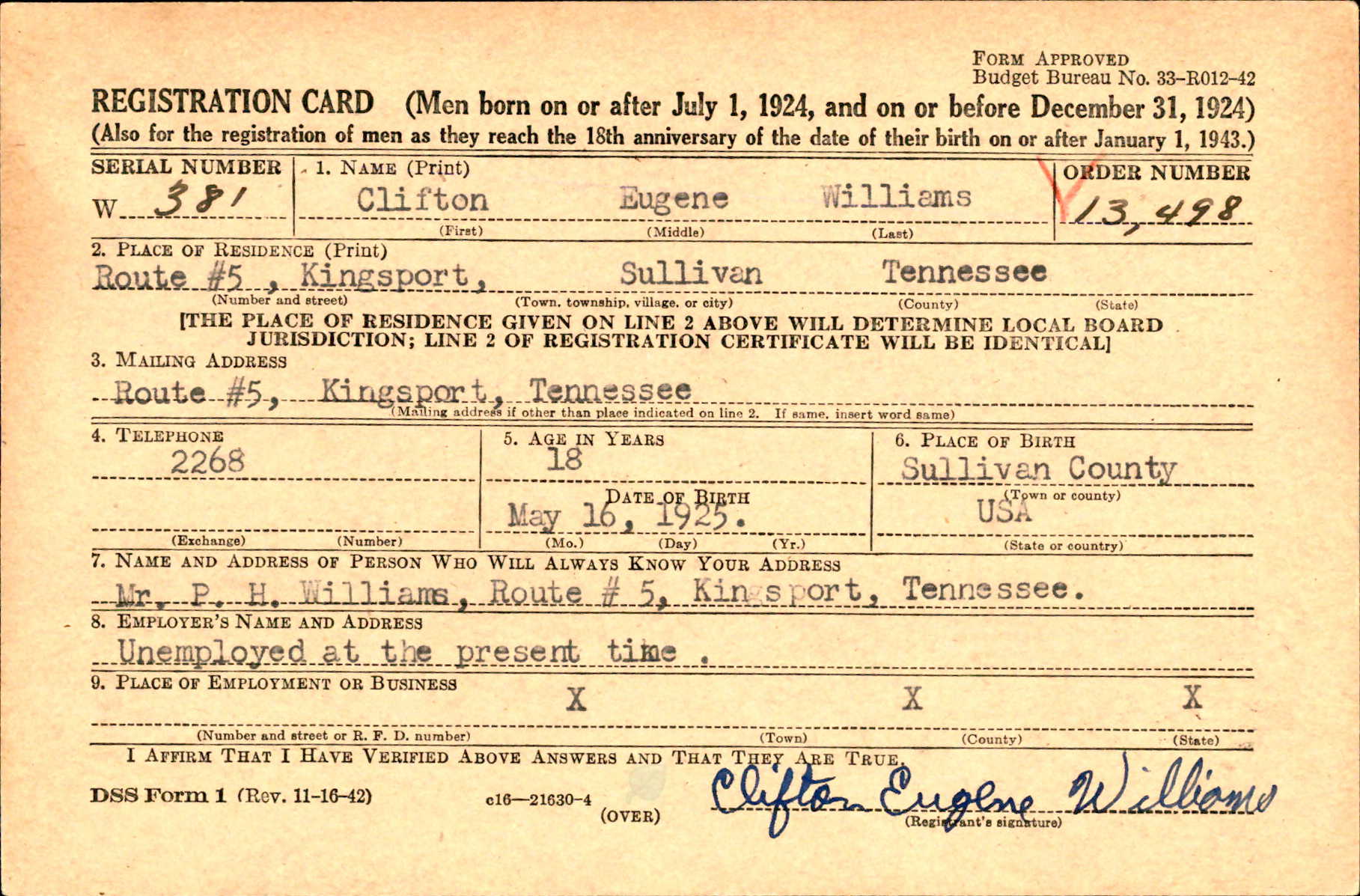 Clifton Eugene Williams was born on 16 May 1925, the son of Patrick H. Williams and Grace E. Williams. He was married with Velva ( Velvia) R. Conkin and father of Cliffton Eugene Williams Jr.