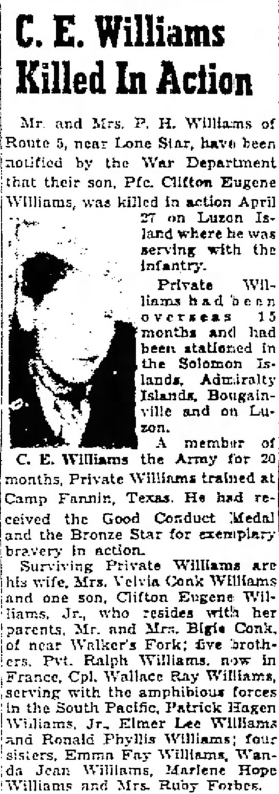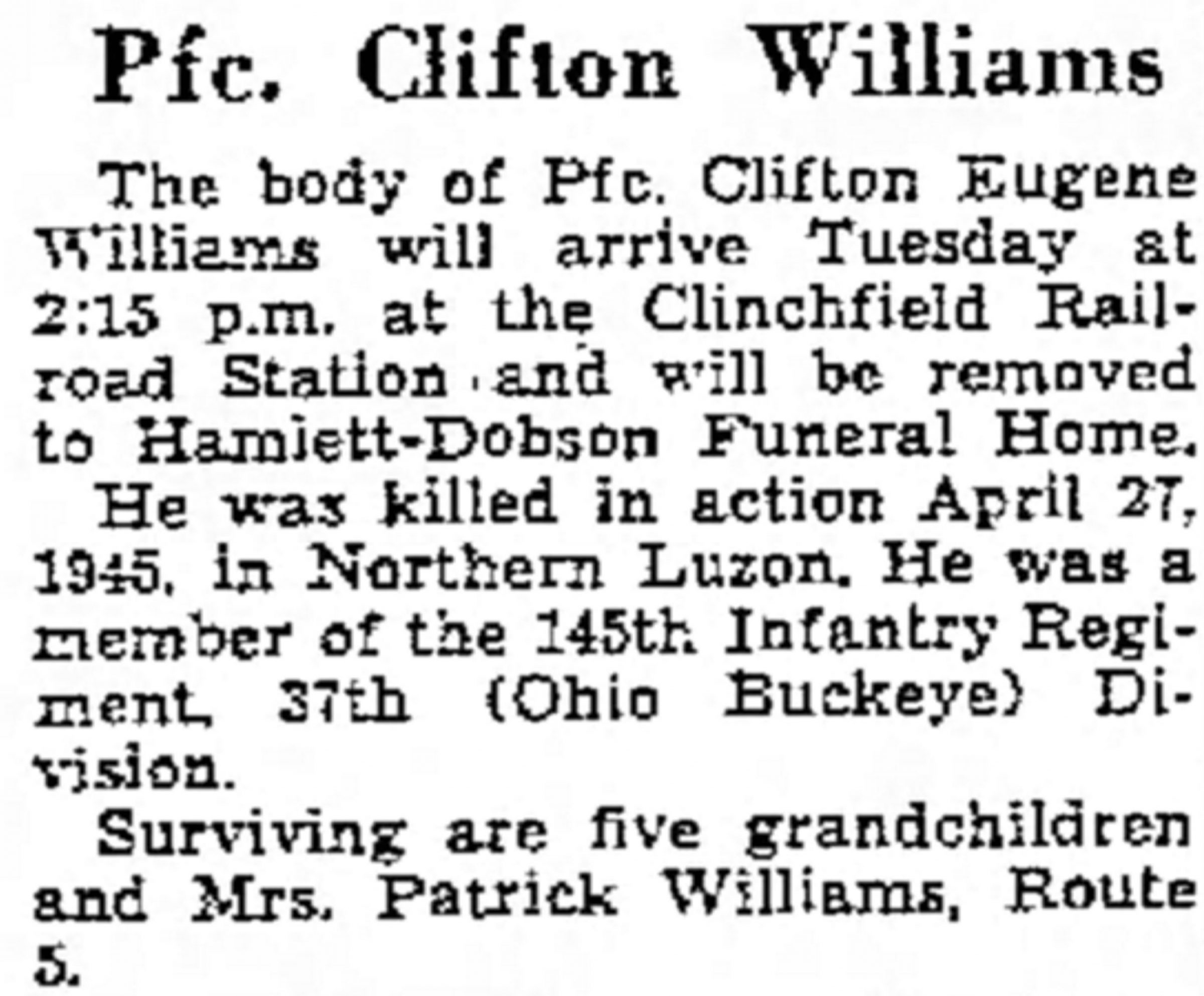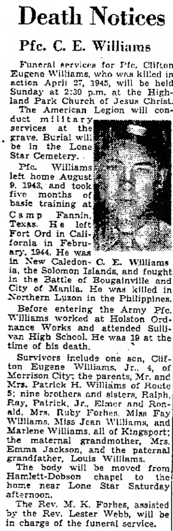 Funeral services for PFC Clifton Eugenen Williams, who was killed in action April 27, 1945, will be held Sunday at 2:30 p.m. at the Highland Park Church of Jesus Christ. The American Legion will conduct military services at the grave. Burial will be in the Lone Star Cemetery.