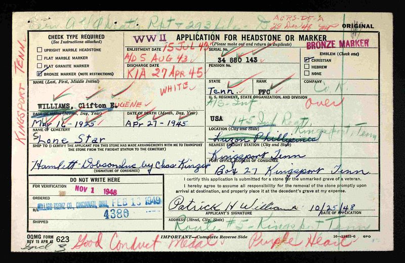 PFC Williams left home August 9, 1943, and took five months of basic training at Camp Fannin, Texas. He let Fort Ord in California in February, 1944. He was in New Caledonia, the Solomon Islands, and fought in the Battle of Bougainville and City of Manila. He was killed in Northern Luzon in the Philippines. Before entering the Army PFC Williams worked at Holston Ordnance Works and attended Sullivan High School. He was 19 at the time of his death.