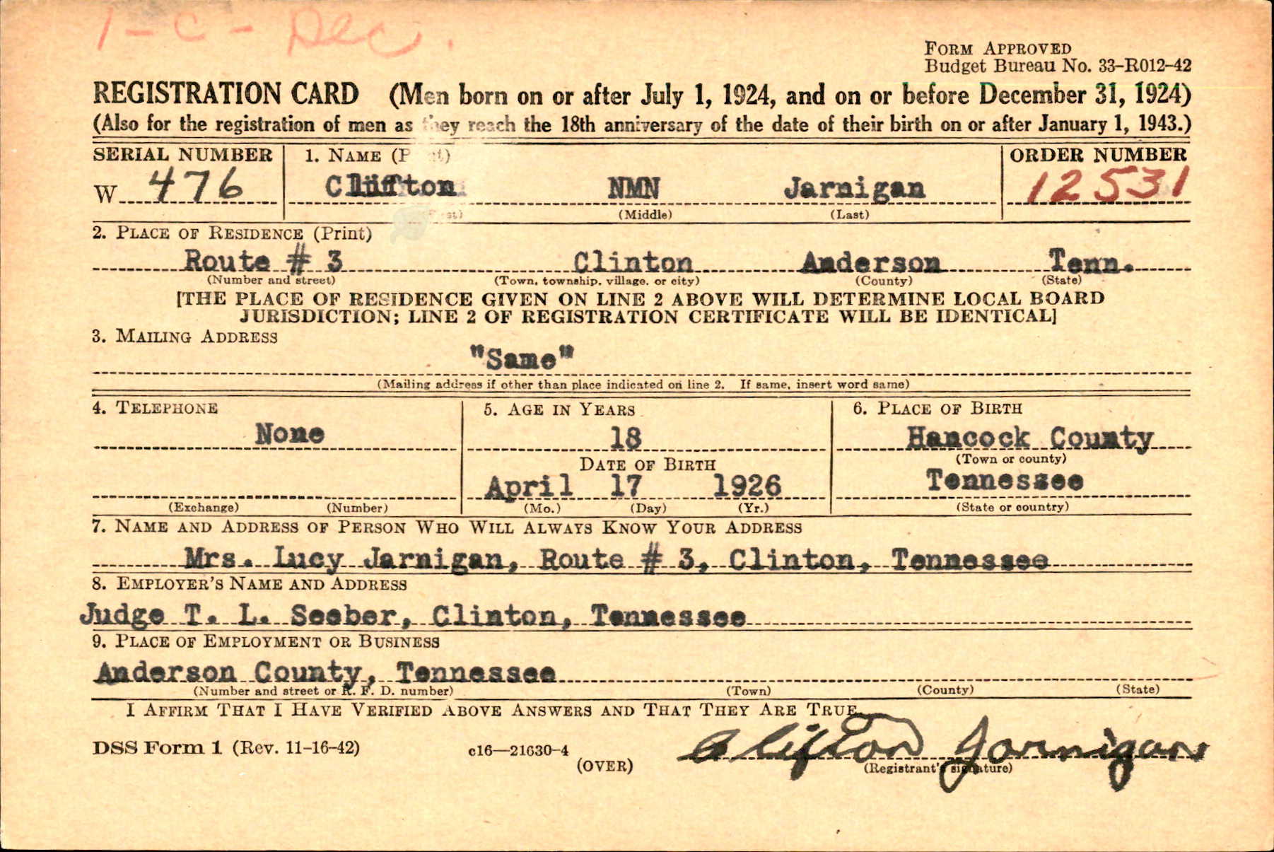 Pvt Clifton Jarnigan was killed in action in Germany. He was the son of William Clinton Jarnigan and Lucinda Cook.