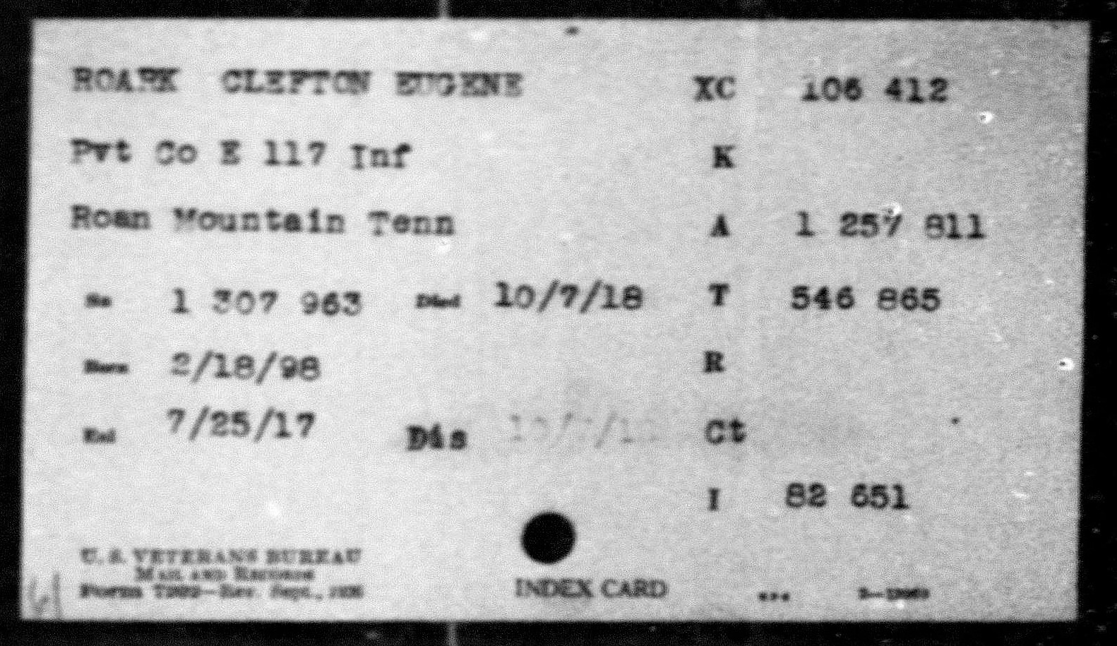 Clifton Eugene Roark was born 18 Febuary 1898, Roan Mountain, Carter County, Tennessee, son of Roby Ross Roark and Nannie E. Perry.