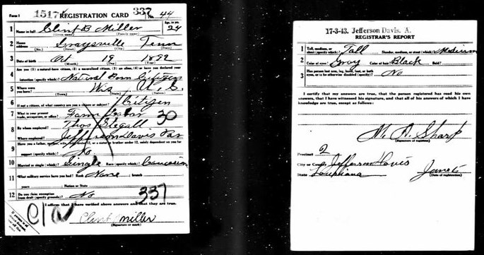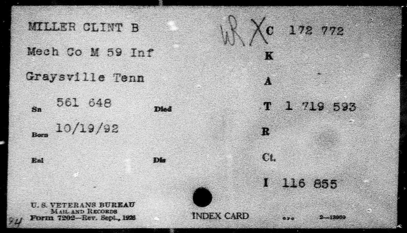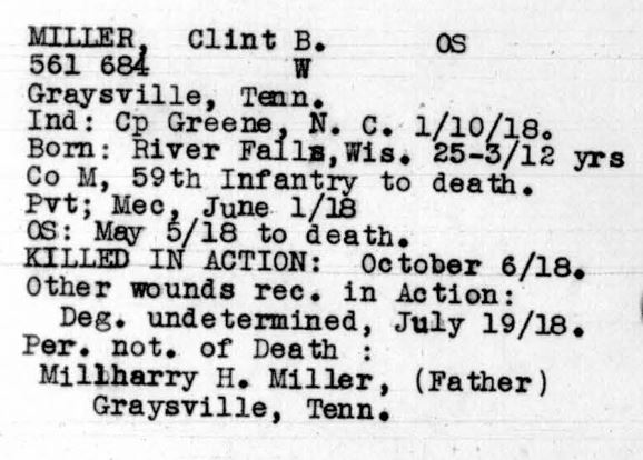 Clint B. Miller was born in River Falls, Wisconsin, 19 October 1892 to Harry Horace Miller and Delia I. Winn. He entered the service from North Carolina. He was wounded in July and killed in action on 6 October 1918 and is buried at the Meuse-Argonne American Cemetery at Plot B, Row 45, Grave 3.