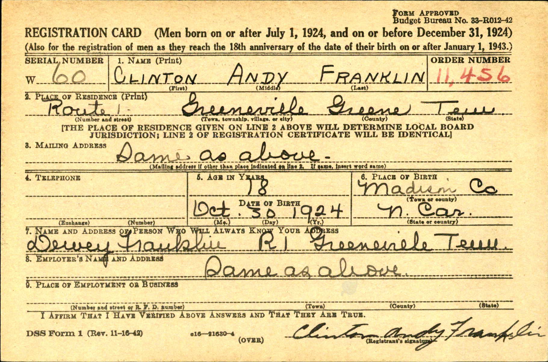 Clinton Andy Franklin was born in Madison County, North Carolina, the son of Dewey Hopson Franklin and Edith Leora Wilds. Husband of Alice LaRue Willis and father of Aundra Ann Franklin.