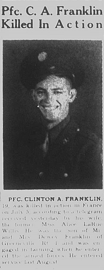 Pfc. Clinton A. Franklin, 19, was killed in action in France on July 5, according to a telegram received yesterday by his wife, the former Miss Alice LaRue Willis. He was the son of Mr. and Mrs. Dewey Franklin of Greeneville, Rt.1 and was engaged in farming when he entered the armed forces. He entered service last August.