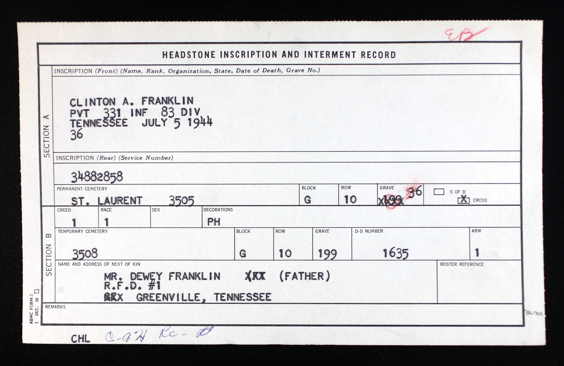 Private Clinton A. Franklin was assigned to the 331st Infantry Regiment, 83rd Infantry Division. At the time of his death the Division was landed as reinforcements across Omaha Beach after riding out a heavy storm in the English Channel. It entered combat for the first time on 4th of July 1944 at Carentan. Pvt Franklin was killed in action on 5 July 1944 and is is interred at G,10,36, Normandy American Cemetery, Colleville-sur-Mer, France.