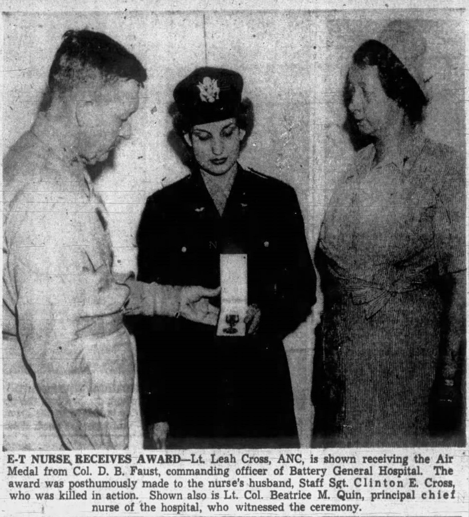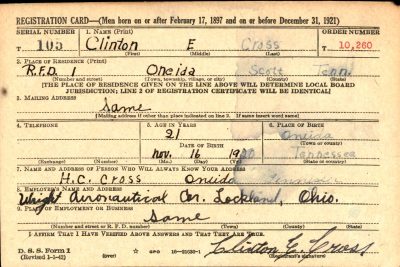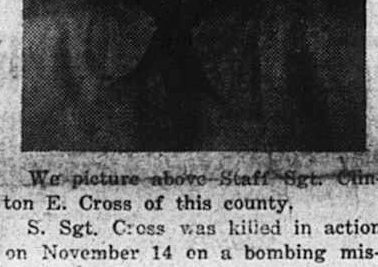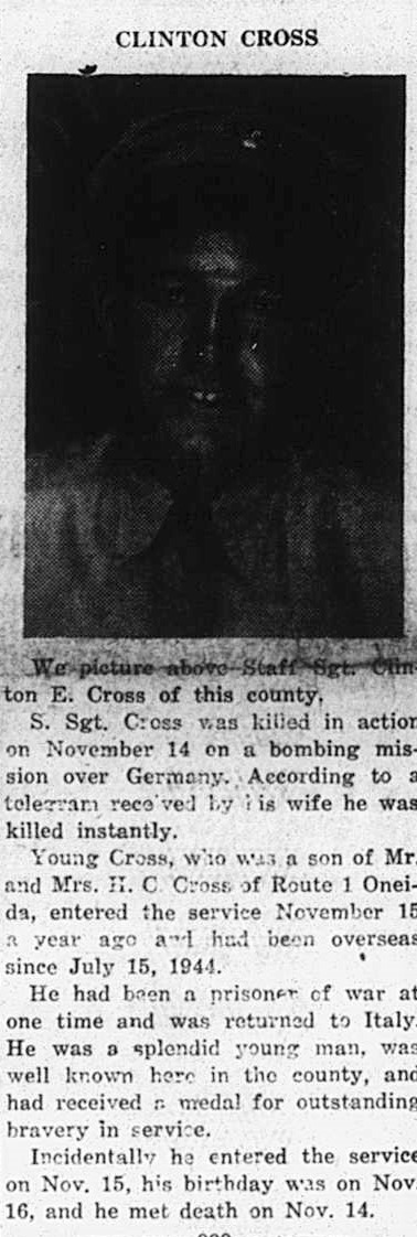 Staff Sgt. Clinton E Cross was killed in action on November 14 on a bombing mission over Germany. According to a telegram received by his wife he was killed instantly.Young Cross, who was a son of Mr. and Mrs. H.C. Cross of Route 1 Oneida, entered the service November 15 a year ago and had been overseas since July 15, 1944. He had been a prisoner of war at one time and was returned to Italy. He was a splendid Young man, was well know here in the county and had received a medal for outstanding bravery in service. Incidentally he entered the service on Nov. 15, his birthday was on Nov. 16, and he met death on Nov. 14.