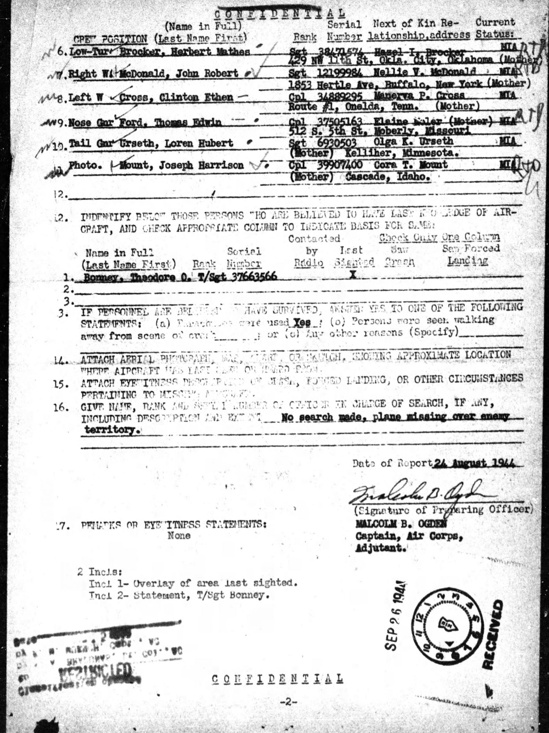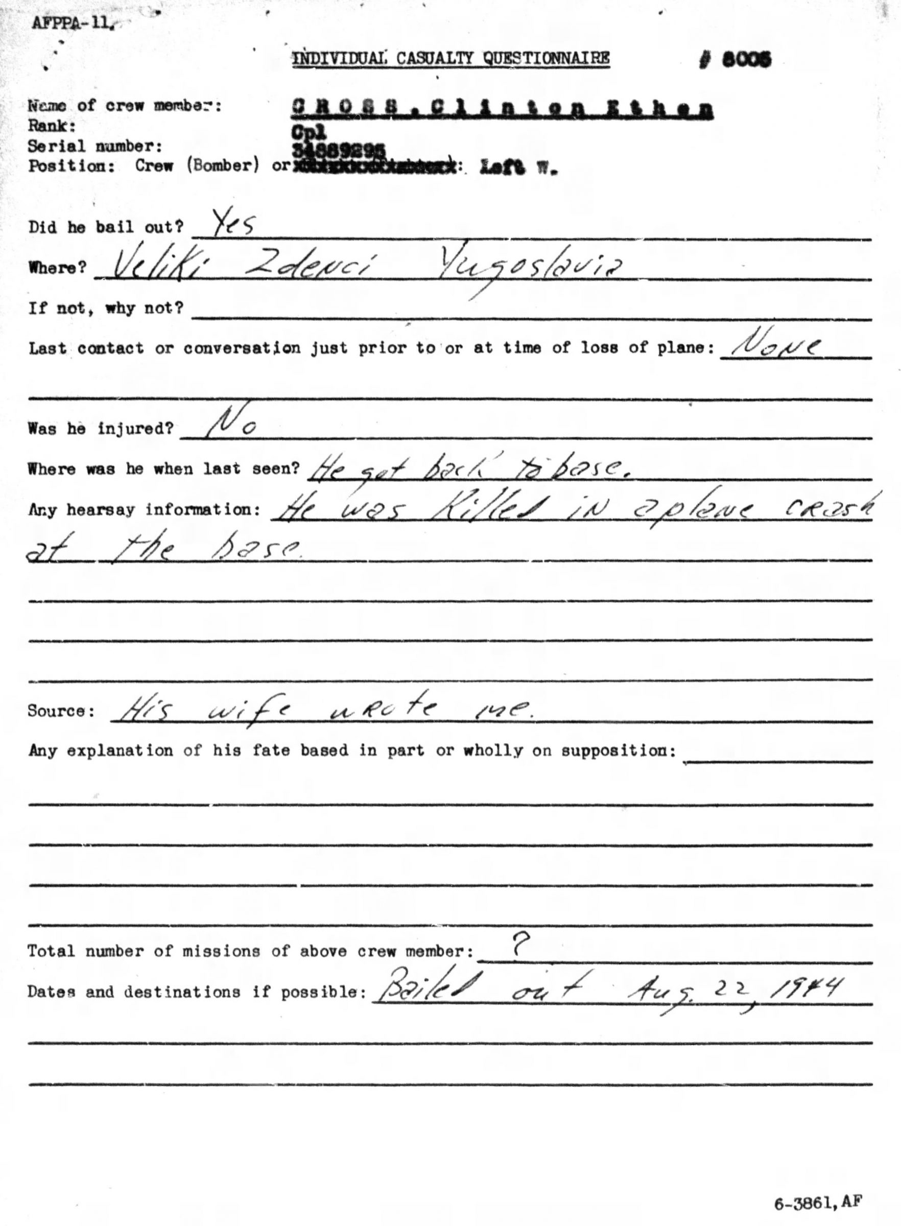 Staff Sergeant Clinton Ethen Cross was a Left Waist Gunner on a B-24H, Serialnumber 41-28816, nicknamed Scrappy. They departed from Castellucio Field in Italy on a bombing mission to the oil storage tanks in Vienna, Austria on 22 August 1944. The aircraft was flying in number seven position. En route to their home base they feathered one engine and the ship then dropped behind and disappeared from the formation. All crew members bailed out NW of Daruvar, Yugoslavia. The pilot and co-pilot made it back to the base and completed their missions. According to a crew member Clinton Cross also made it back but was killed latter in a crack-up on take off at the base. The other crew members were taken Prisoner of War.