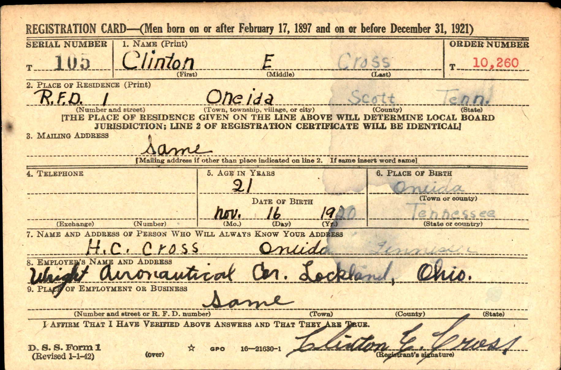 Clinton Cross was born on 16 November 1920 in Oneida, Tennessee. He was the son of Henry Columbus Cross and Manerva “Minnie” Pennington. He was married to Leah Cross. He Died non Battle 14 November 1944 in Italy