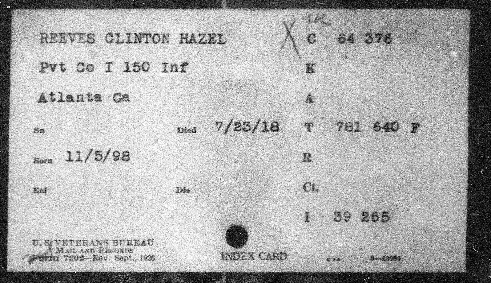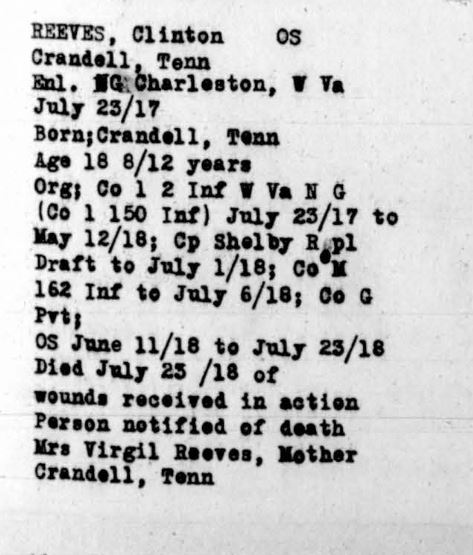 Clinton Hazel Reeves was born 1899 in Crandall, Tennessee, son of Hardin Samuel Reeves and Virgie Malissa McQueen. He died of wounds received in action.