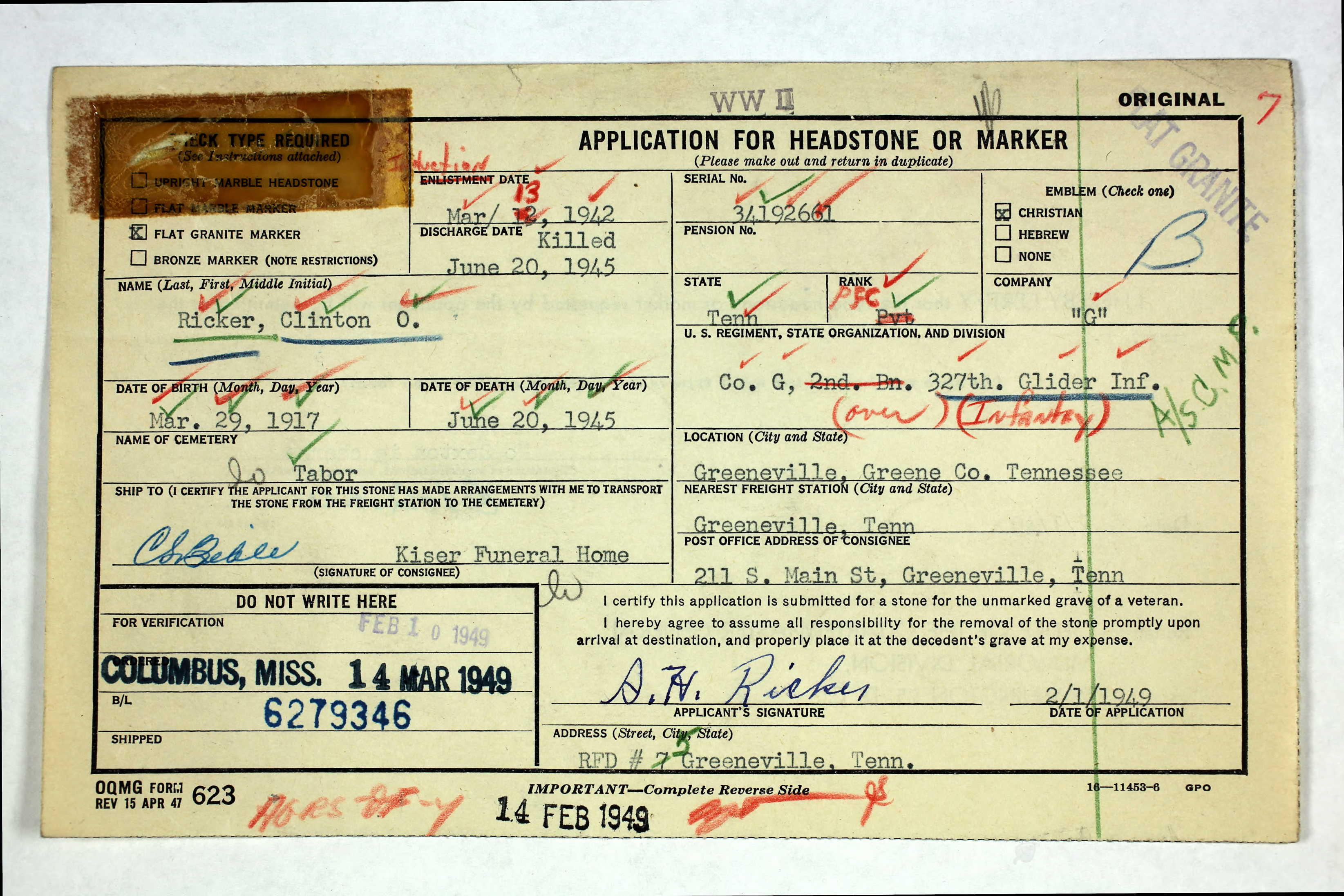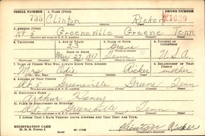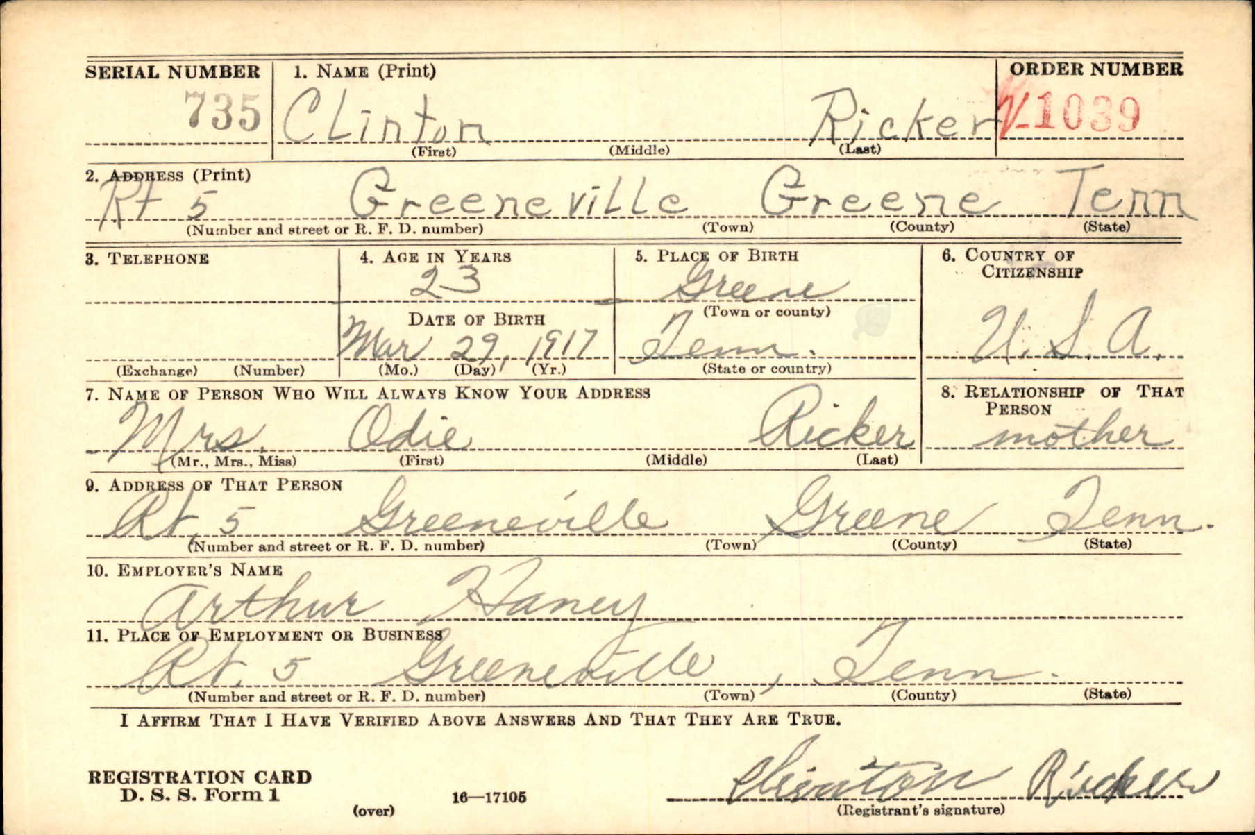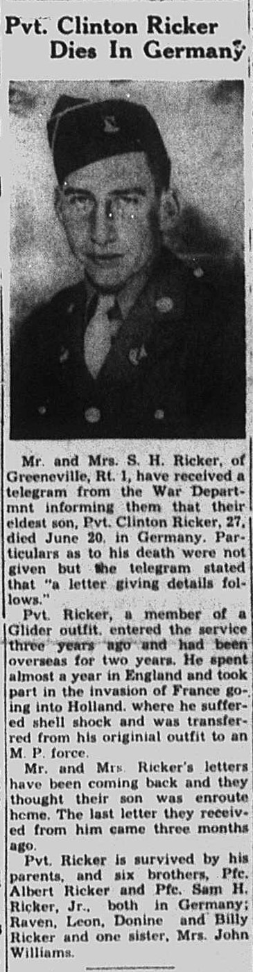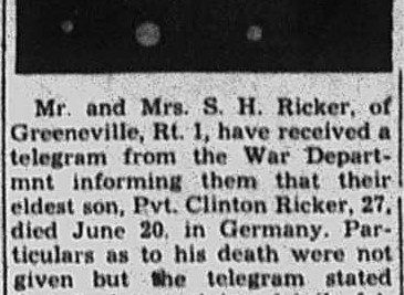 Mr. and Mrs. S.H. Ricker, of Greeneville, Rt. 1, have received a telegram from the War Department informing them that their eldest son, Pvt. Clinton Ricker, 27, died June 20, in Germany. Particulars as to his death were not given but the telegram stated that a letter giving details follows,