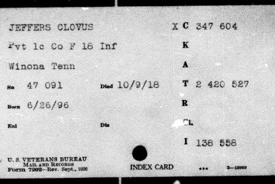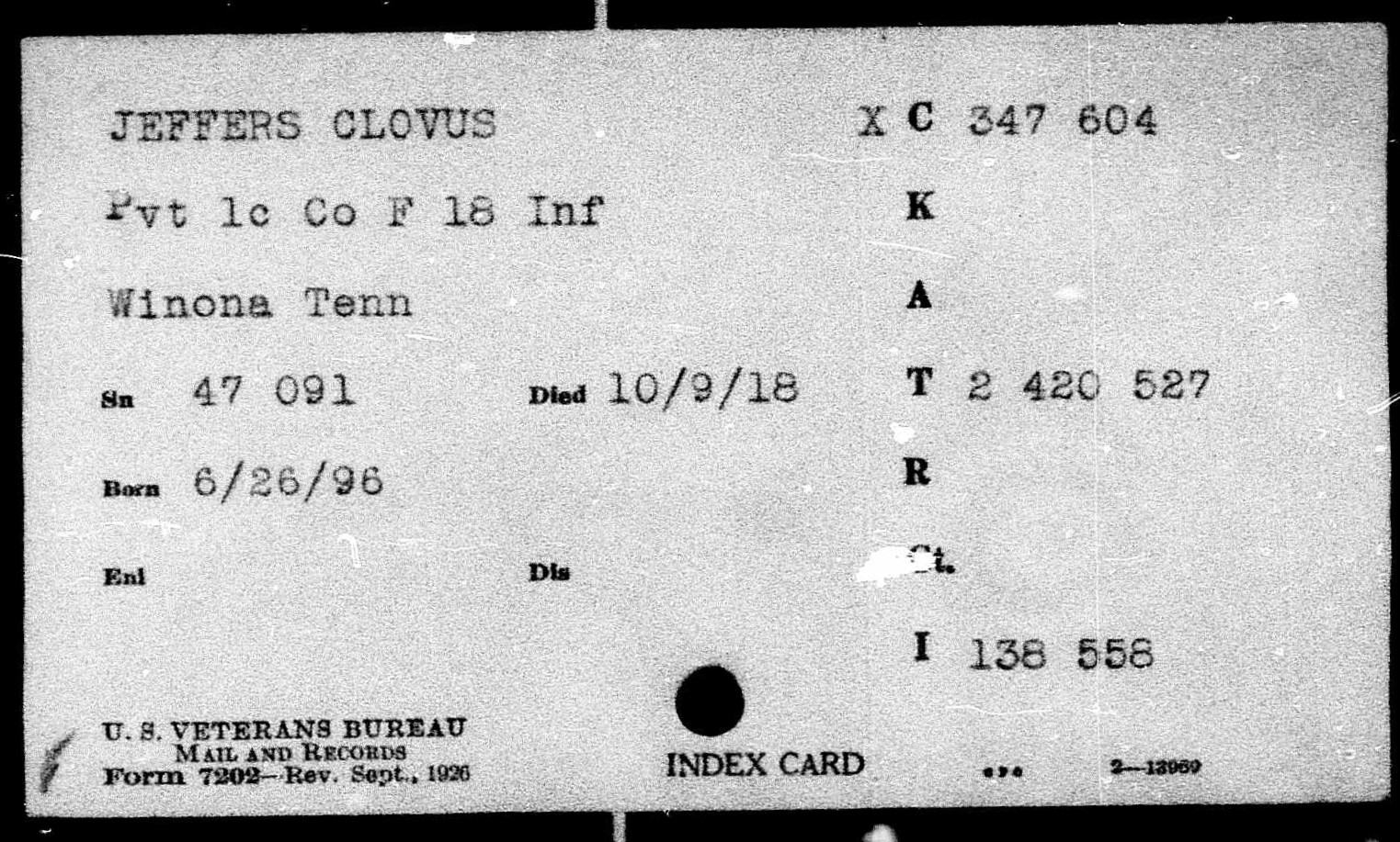 Clovis Jeffers was born in Scott County, Tennessee, son of Melvina Jeffers. He enlisted at Columbus Barracks in Ohio on 19 September 1916.