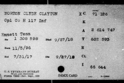 Clyde Clayton Morton was born in Emmett, Tennessee in 1896 to William Stephens Morton and Jennie L. Delaney. He joined the Army at the age of 20. He died from effects of gas at Rouen, France, on September 29, 1918. He served with Company H, 117th Infantry.