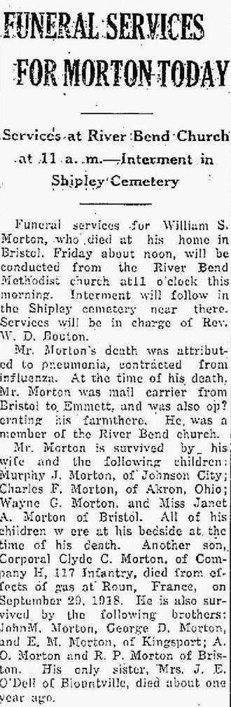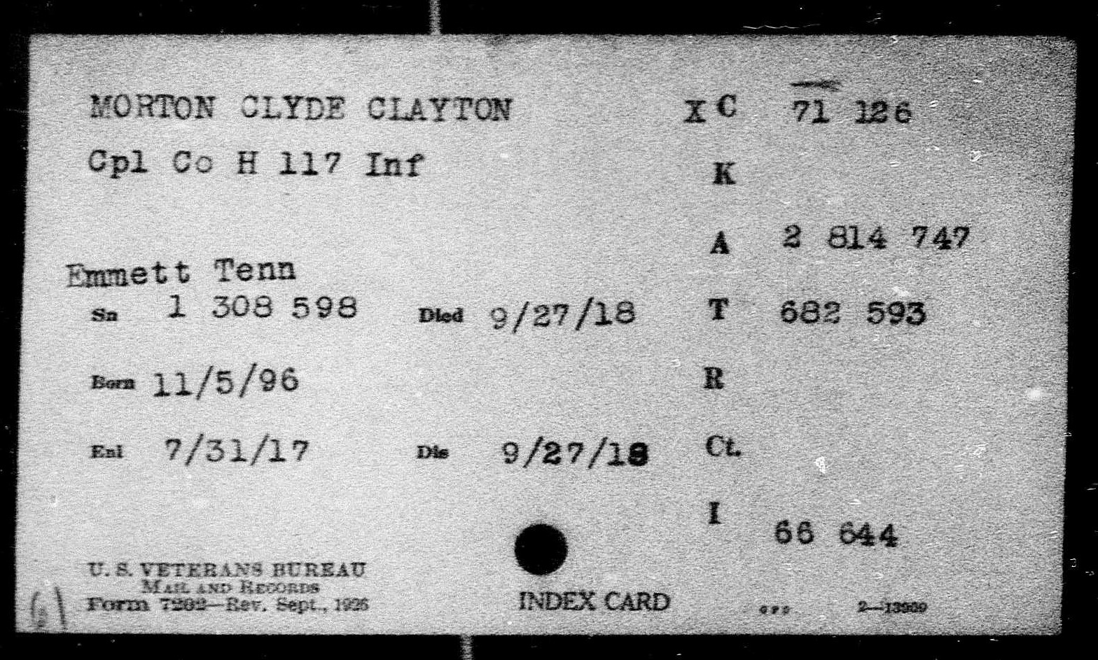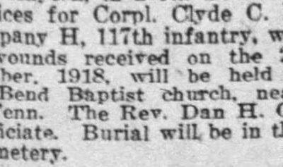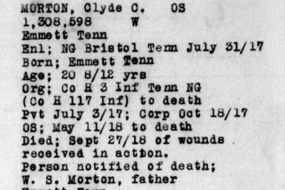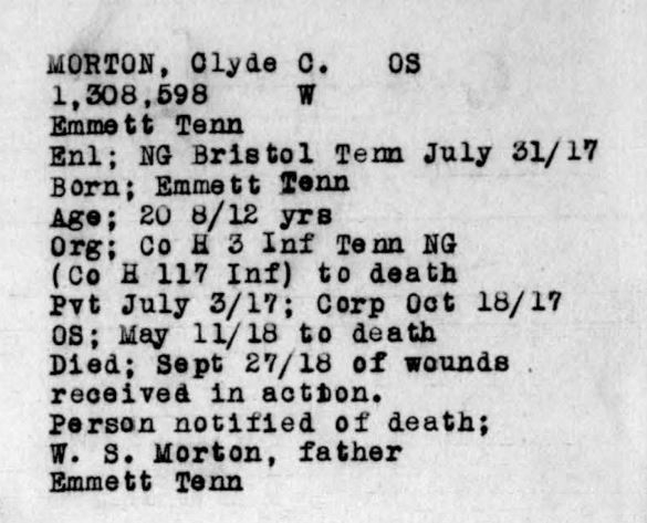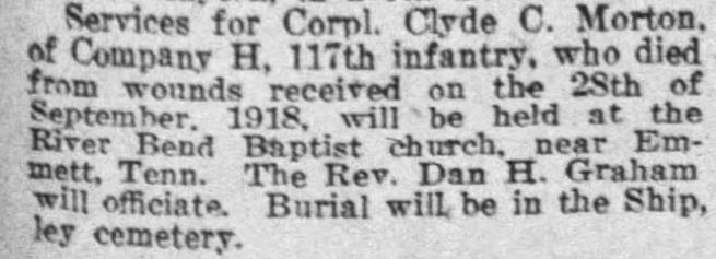 The Chattanooga Daily Times, Services for Corpl. Clyde C. Morton, of Company H, 117th infantry, who died of wounds received on the 28th of September, 1918, will be held at the River Bend Baptist church, near Emmett, Tenn. Burial will be in the Shipley cemetery.