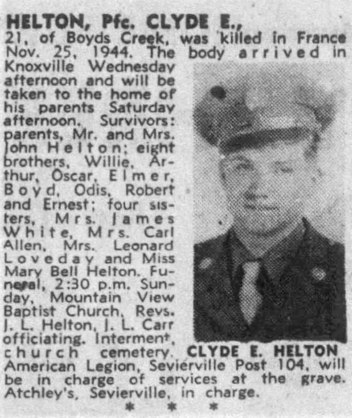 Pfc. Clyde E. Helton, 21, of Boyd’s Creek, was killed in France Nov. 25, 1944. The body arrived in Knoxville and will be taken to the home of his parents, Mr. and Mrs. John Helton; eight brothers, Willie, Arthur, Oscar, Elmer, Boyd, Odis, Robert and Ernest; four sisters, Mrs. James White, Mrs. Carl Allen, Mrs. Leonard Loveday and Miss Mary Bell Helton.