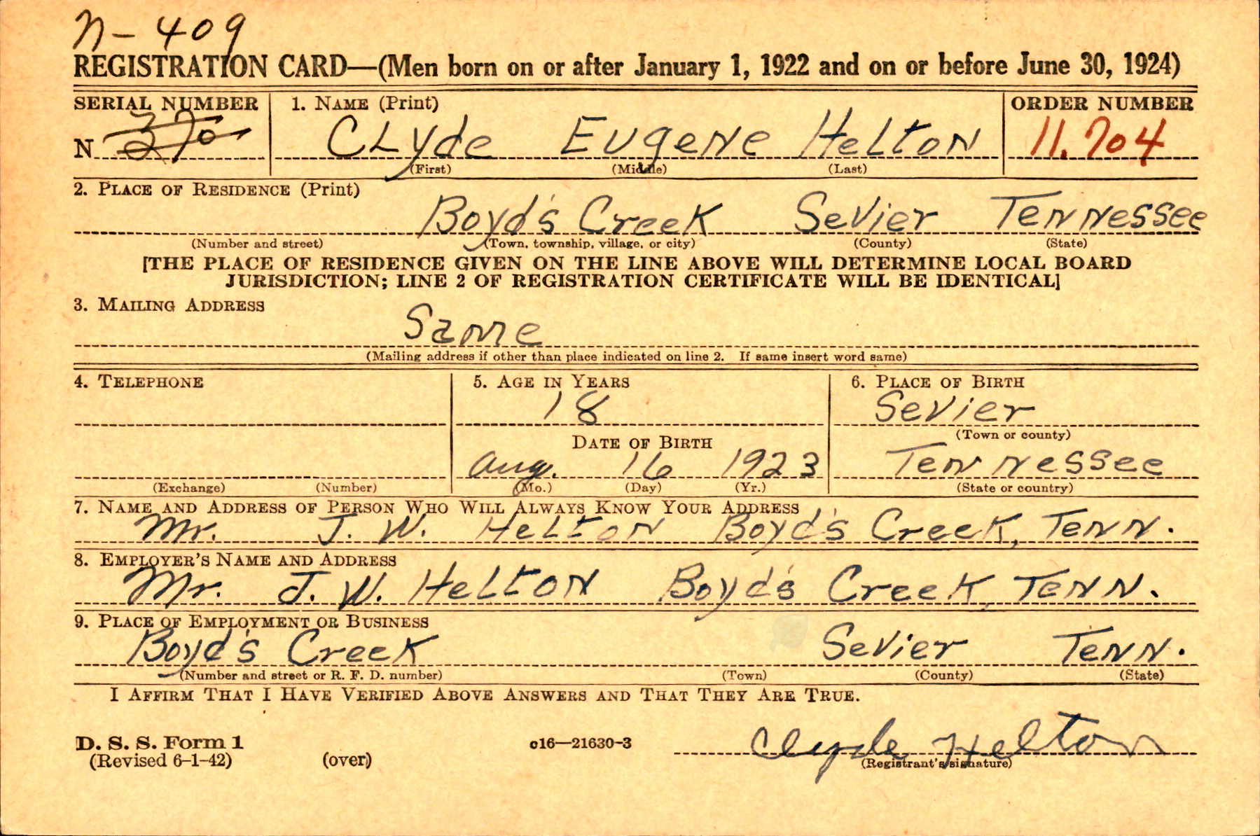 Clyde Eugene Helton was born on 16 August 1923, Sevier County, Tennessee, the son of John Walter Helton and Martha J England.