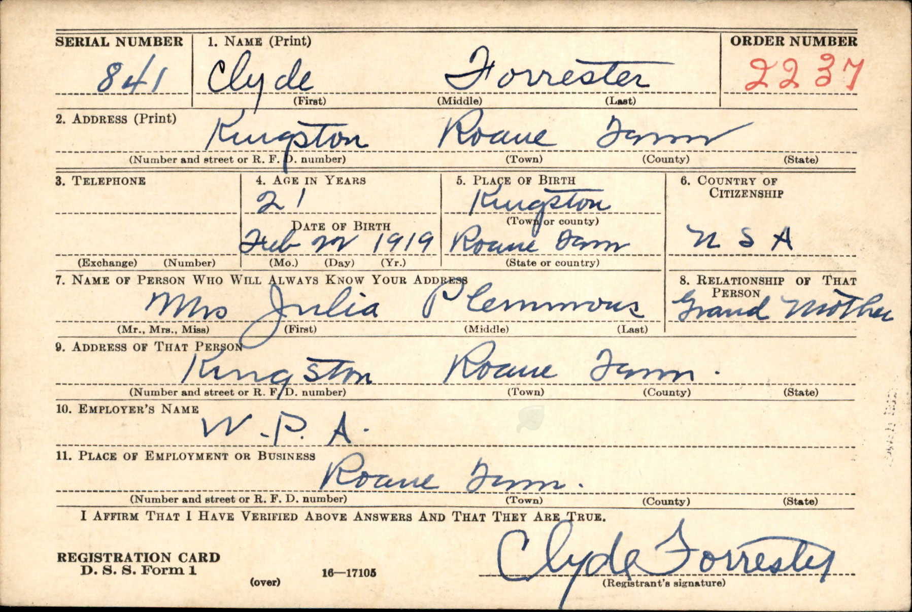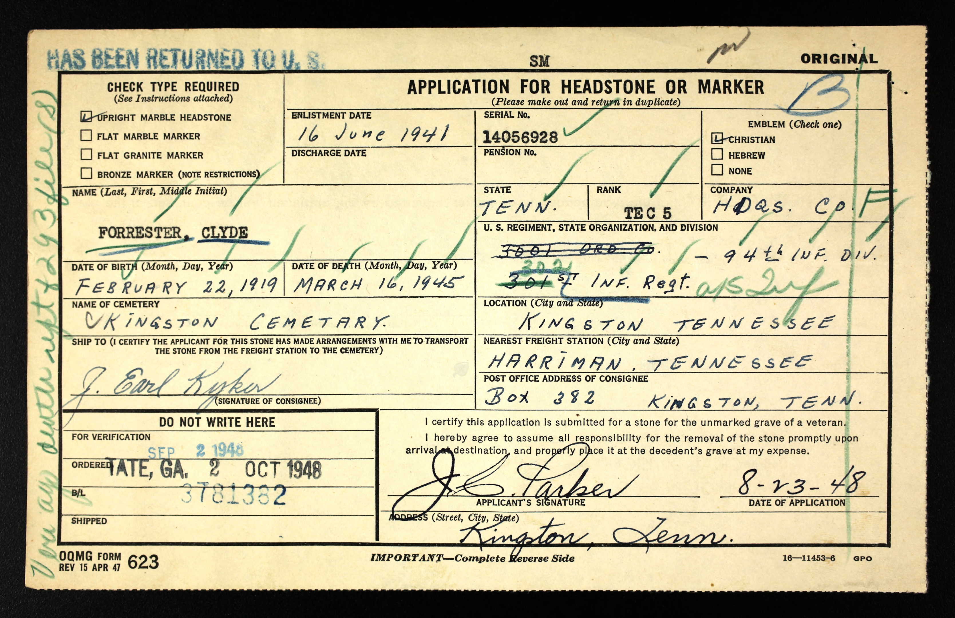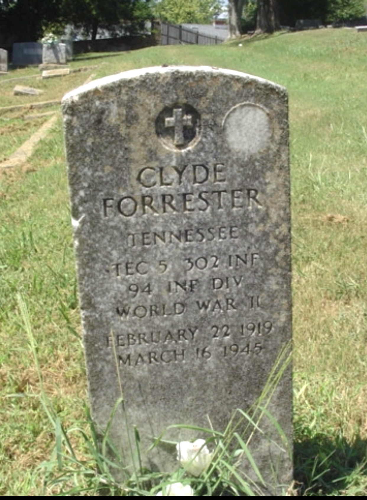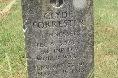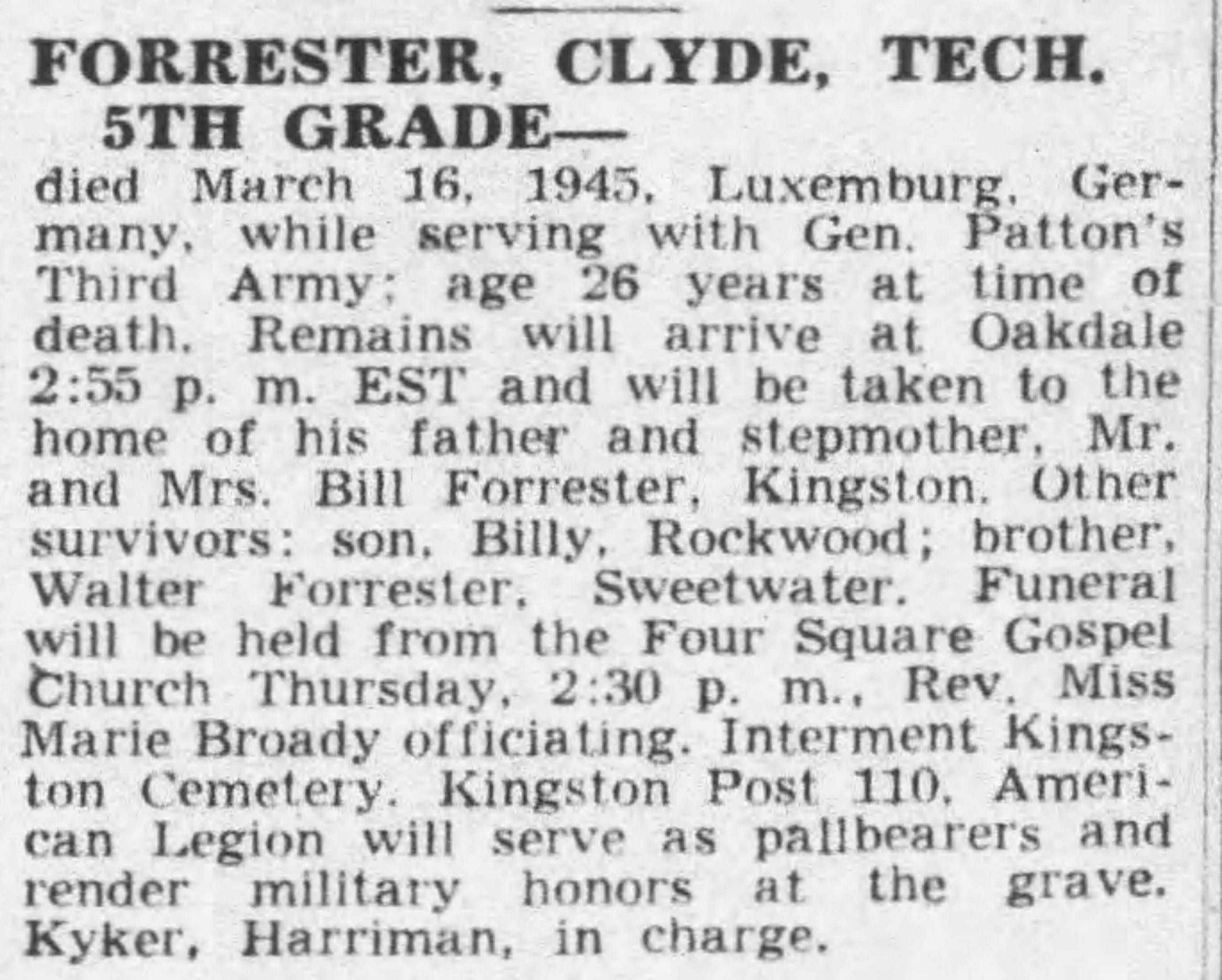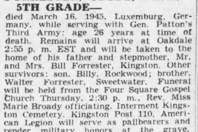 died March 16, 1945, Luxemburg, Germany, while serving with Gen. Patton’s Third Army: age 26 years at time of death. Remains will be taken to the home of his father and stepmother, Mr. and Mrs. Bill Forrester, Kingston. Other survivors: son, Billy, Rockwood; brother Walter Forrester, Sweetwater. Funeral will be held from the Four Square Gospel Church Thursday 3:30 p.m. Rev. Miss Broady officiating. Interment Kingston Cemetery. Kingston Post 110, American Legion will serve as pallbearers and render military honors at the grave. Kyker, Harriman, in charge.