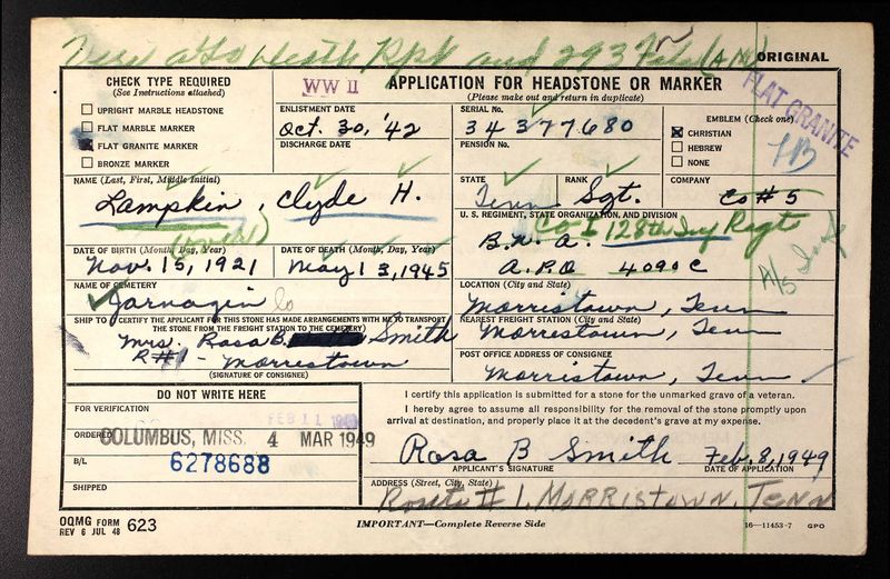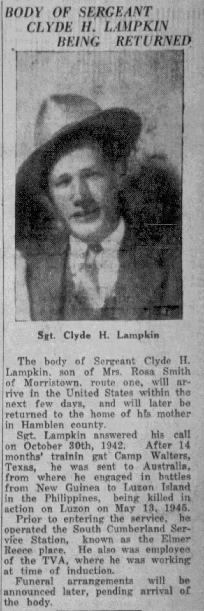The body of Sergeant Clyd H. Lampkin, son of Mrs. Rosa Smith of Morristown, route one, will arrive in the United States within the next few days, and will later be returned to the home of his mother in Hamblen county. Sgt. Lampkin answered his call on October 30, 1942. After 14 months trainin gat Camp Walters, Texas, he was sent to Australia, from where he engaged in battles from New Guinea to Luzon Island in the Philippines, being killed in action on Luzon on May 13, 1945.