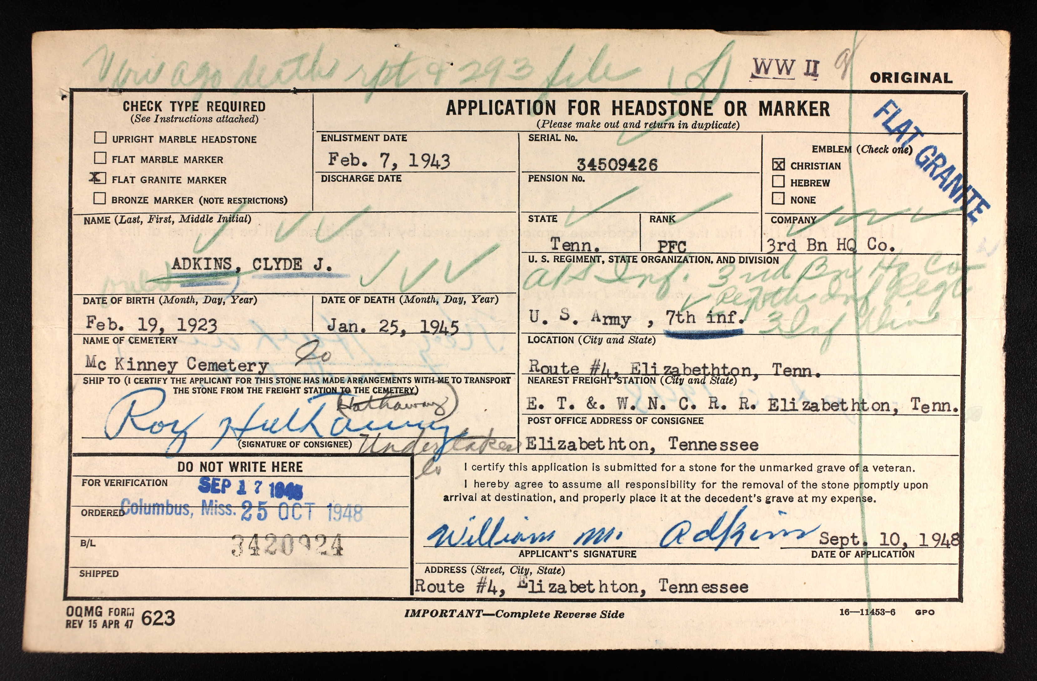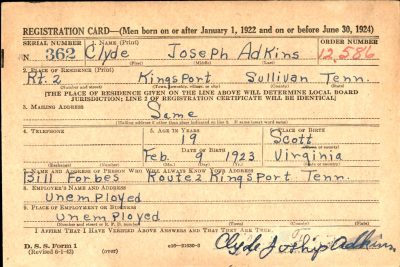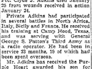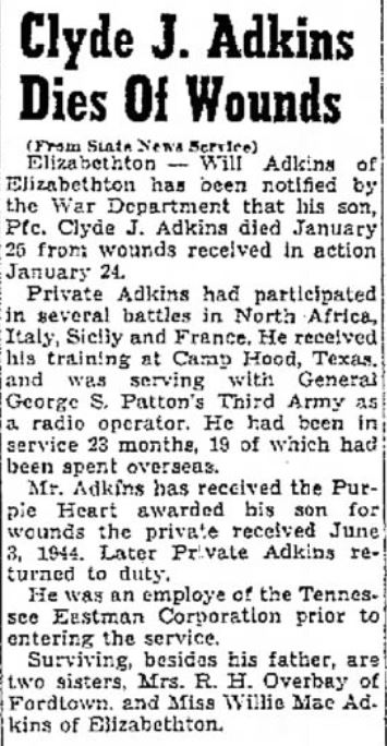 Elizabethton–Will Adkins of Elizabethton has been notified by the War Department that his son, Pfc. Clyde J. Adkins died January 25 from wounds received in action January 24. Private Adkins had participated in several battles in North Africa, Italy, Sicily and France. He received his training at Camp Hood, Texas, and was serving with General George S. Patton’s Third Army as a radio operator. He had been in service 23 months, 19 of which had been spent overseas. Mr. Adkins has received the Purple Heart awarded his son for wounds received June 3, 1944. Later Private Adkins returned to duty. He was an employee of the Tennessee Eastman Corporation prior to entering the service.