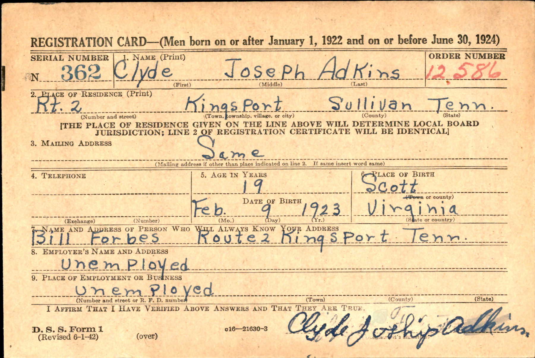 Clyde Joseph Adkins was born on 19 February 1923 in Scott Virginia to William McKinley Adkins and Lina Mae Carver.