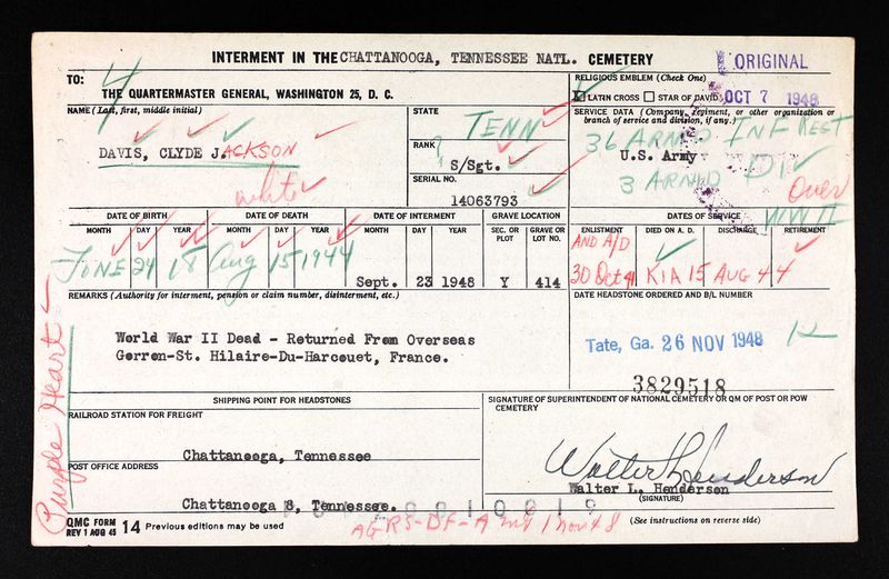 S/Sgt Clyde Jackson Davis was returned from Gorren-St. Hilaire-Du-Harcouet, France.