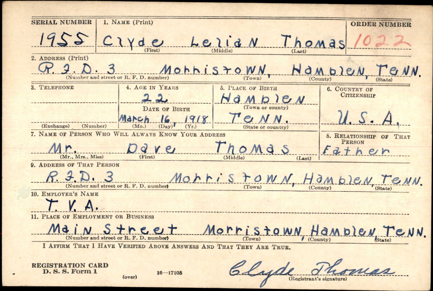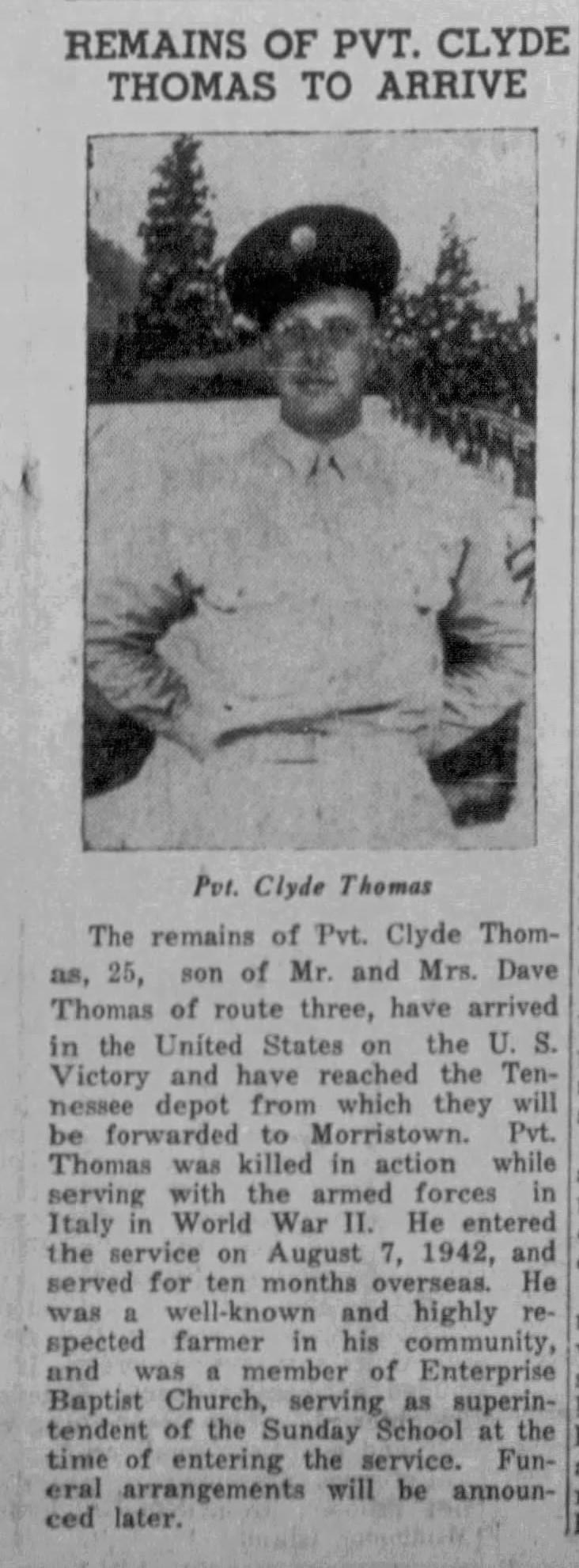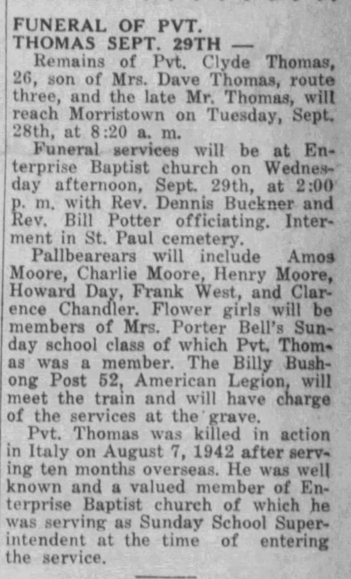 Remains of Pvt. Clyde Thomas, 26, son of Mrs. Dave Thomas, Route three, and the late Mr. Thomas, will reach Morristown on Sept. 28. Interment in St. Paul Cemetery.